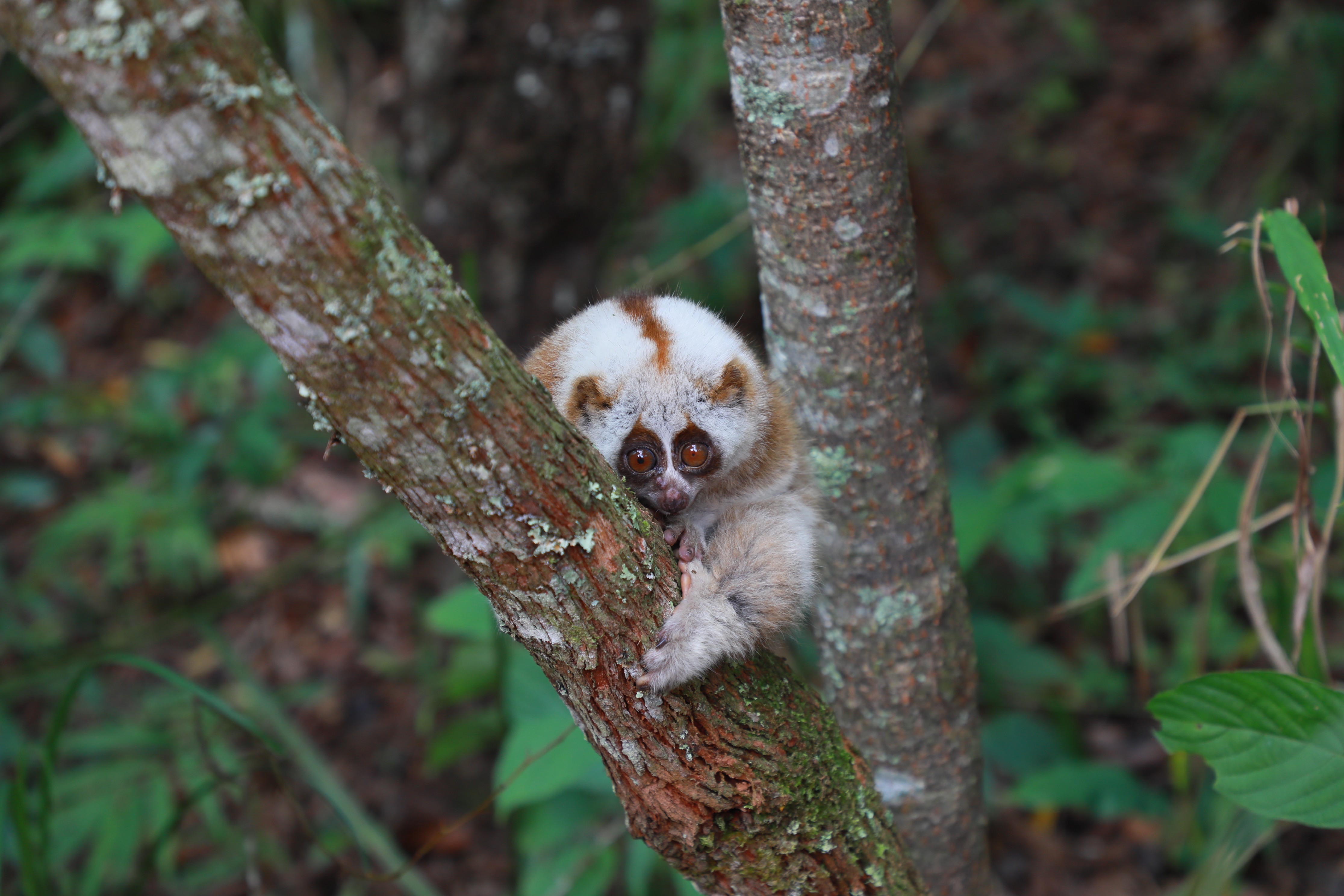 放生的蜂猴睁大眼睛观察环境