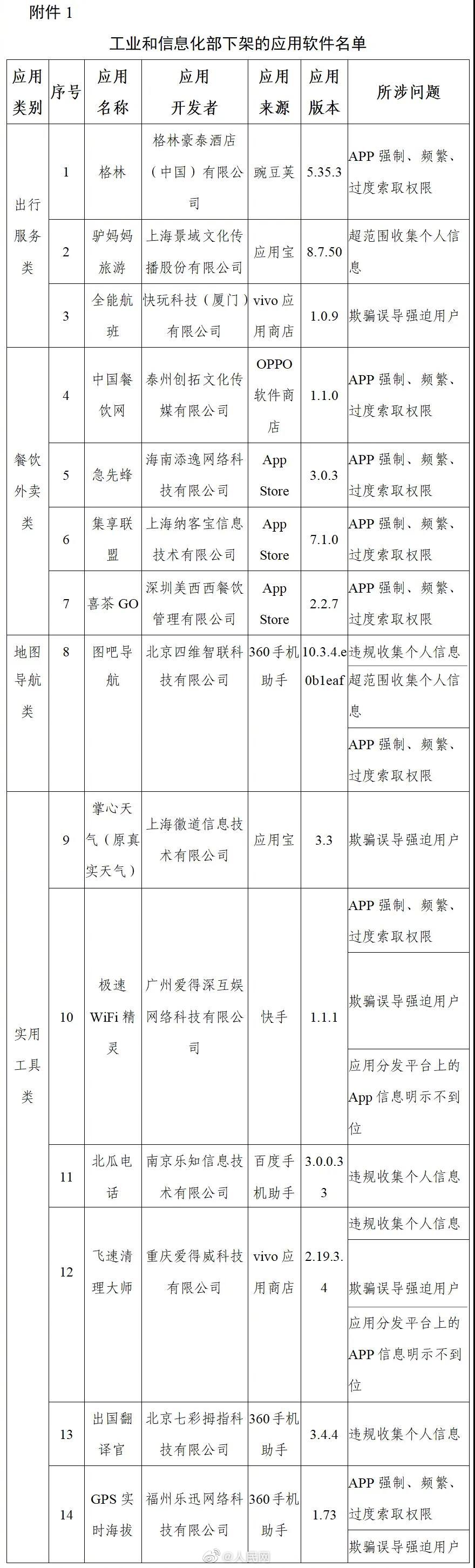 国庆前夕,工信部重点对假日出行、民生服务类APP进行检测,并对未按要求完成整改的进行了公开通报。截至目前,尚有96款APP未按时限要求完成整改。依据《中华人民共和国网络安全法》等法律要求,工信部组织对上述96款APP进行下架。