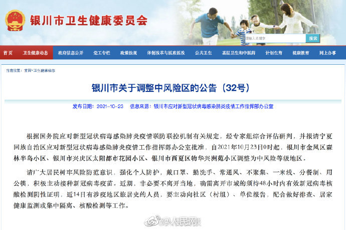 据宁夏银川卫健委通报,根据国务院联防联控机制有关规定,经专家组综合评估研判,并报请自治区批准,自2021年10月23日0时起,银川市金凤区森林半岛小区、银川市兴庆区太阳都市花园小区、银川市西夏区物华兴洲苑小区调整为中风险等级地区。@人民网宁夏频道