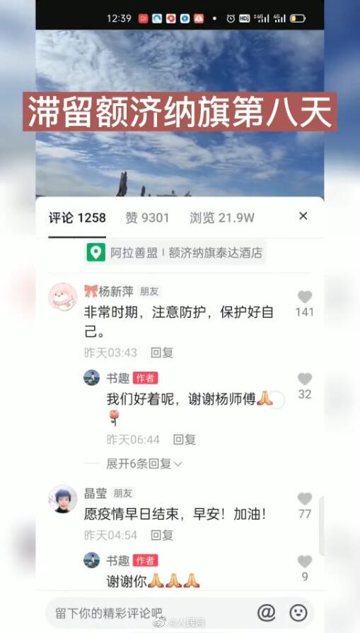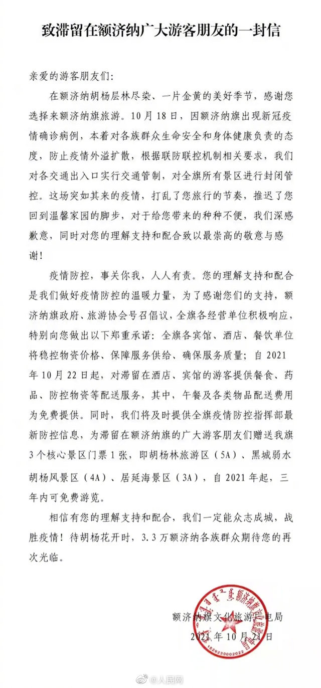 额济纳旗常住人口3万余人。是内蒙古面积最大、人口最少的旗。为保障好滞留的近万名旅客,额济纳旗昼夜奋战,周边紧急驰援,牧民捐出了家中的米面、牛、羊、骆驼,滞留游客也通过社交媒体来加油鼓劲…英雄的额济纳,此役必赢,此战必胜! (人民网内蒙古频道)