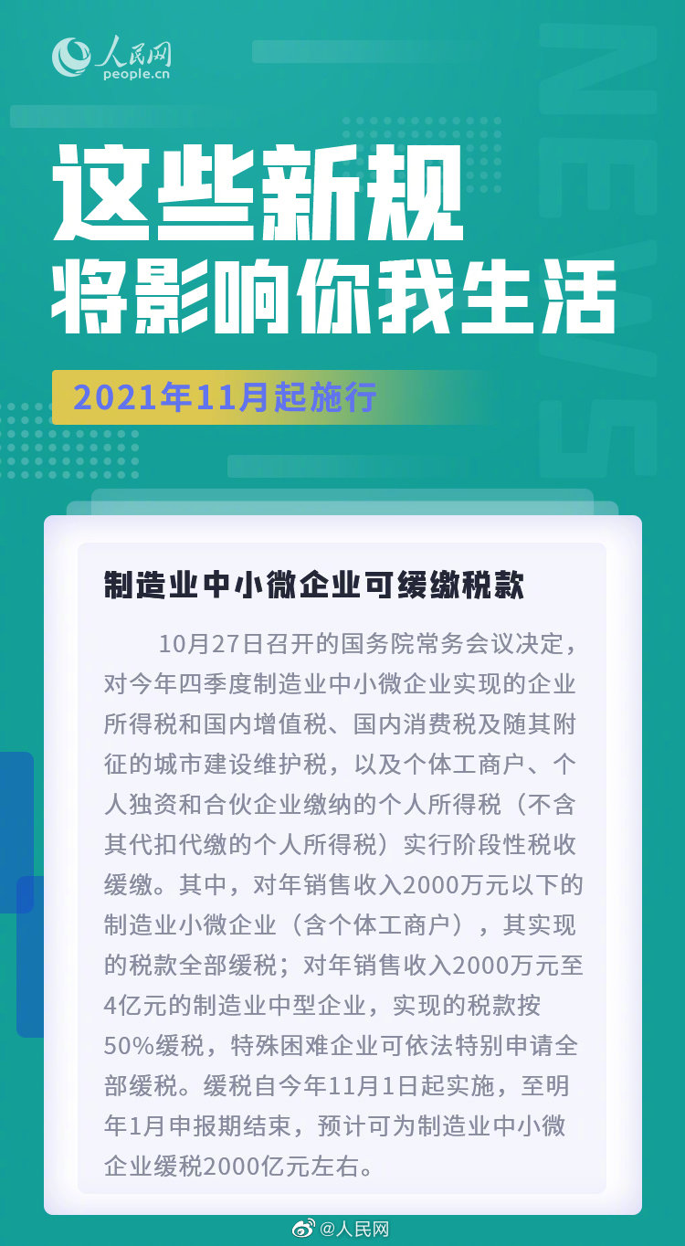 个人信息保护法11月起实施,个人信息保护有了“安全锁”;②制造业中小微企业可缓缴税款;③工资保证金相关规定保障农民工工资权益……11月,这些新规实施,将影响你我生活。(人民网)