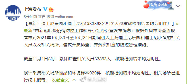 11月1日,据@上海发布,上海市新冠肺炎疫情防控工作领导小组办公室发布消息:根据外省市协查通报,上海市对2021年10月30日至10月31日期间进入上海迪士尼乐园和迪士尼小镇的相关人员以及相关场所,连夜开展排查,并落实相应的防控管理措施。