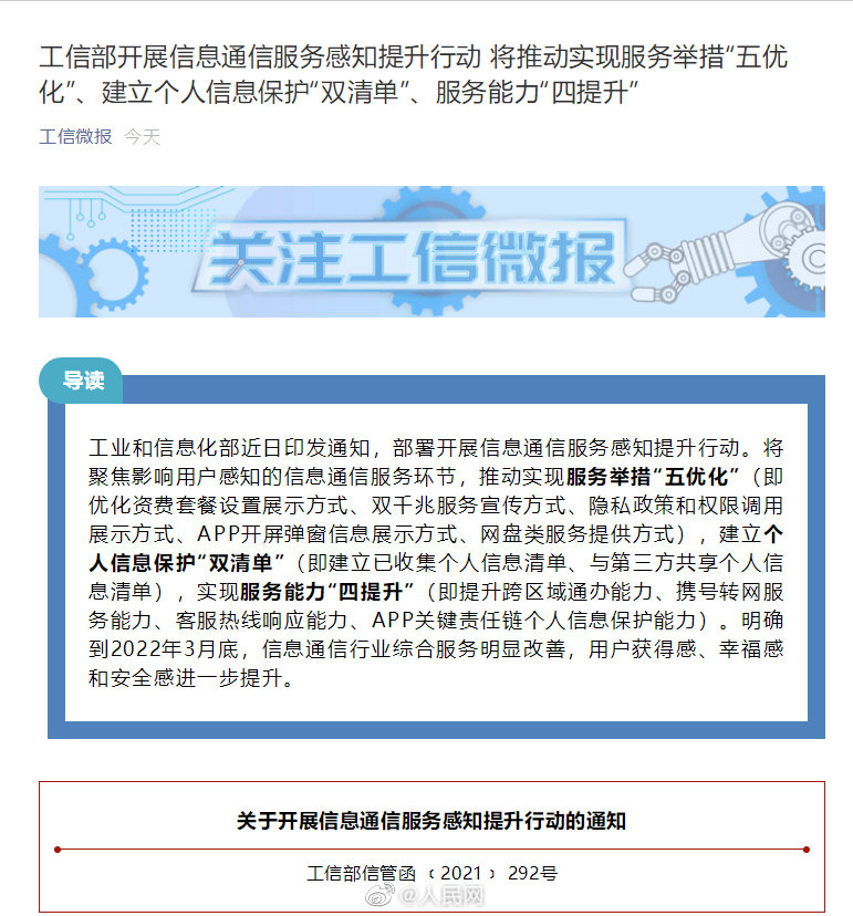 工信部开展信息通信服务感知提升行动 将推动实现服务举措“五优化”、建立个人信息保护“双清单”、服务能力“四提升”