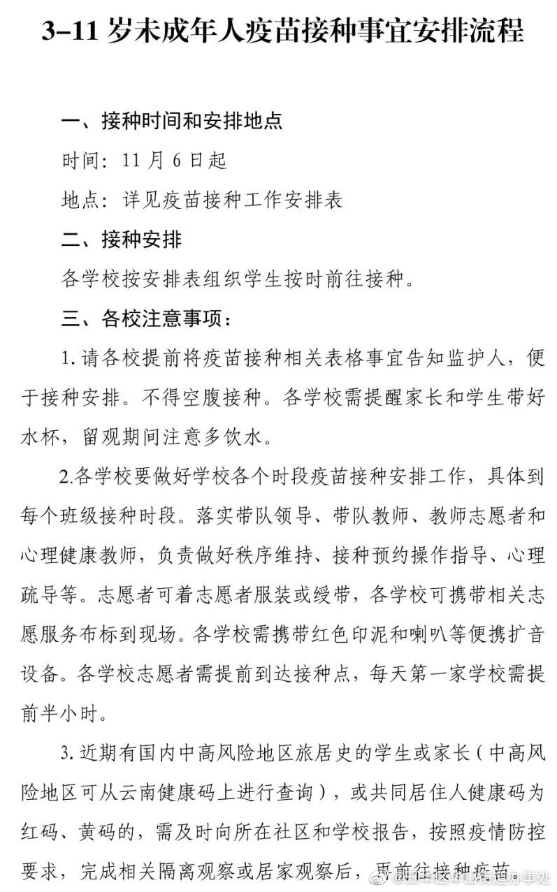 在持续做好12岁以上人群接种工作的基础上,目前,昆明市已启动3—11岁人群新冠疫苗接种工作。11月5日,昆明市五华区发布《关于做好3—11周岁未成年人新冠疫苗接种工作的通知》。