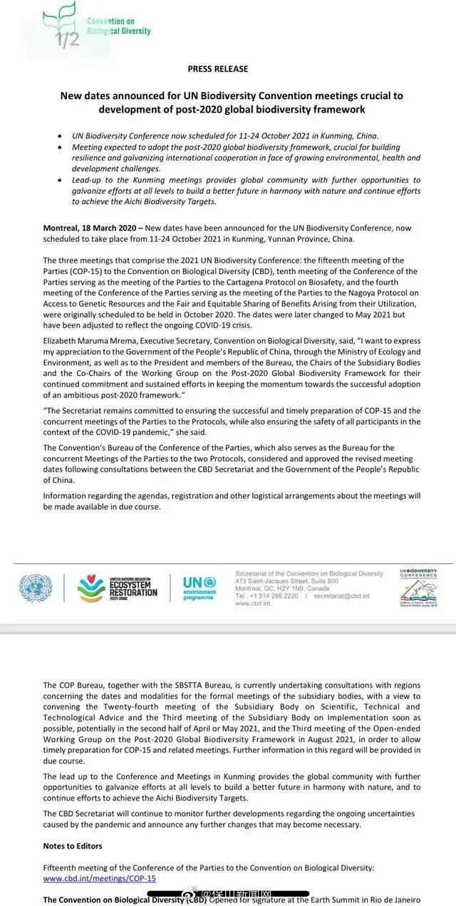 3月19日,中国生物多样性保护与绿色发展基金会,收到生物多样性公约最新通知—— CBD COP15将于2021年10月11日到24日在中国云南昆明举办。(来源:中国生物多样性保护与绿色发展基金会)