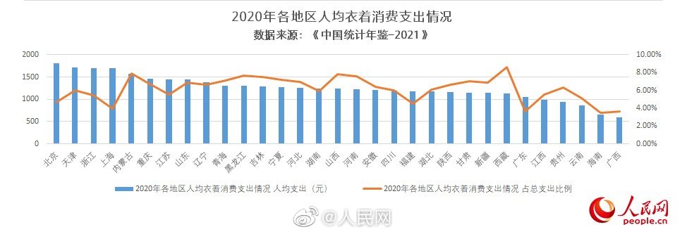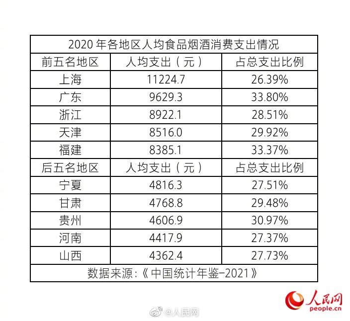国家统计局公布的《中国统计年鉴-2021》显示,#2020年全国居民人均消费支出21209.9元#。分地区看,西藏、内蒙古、山西人均衣着消费支出占本地区人均消费总支出比例最高;上海人均食品烟酒消费支出继续领跑,达11224.7元,超出全国平均75.5%。详戳↓↓(人民网)
