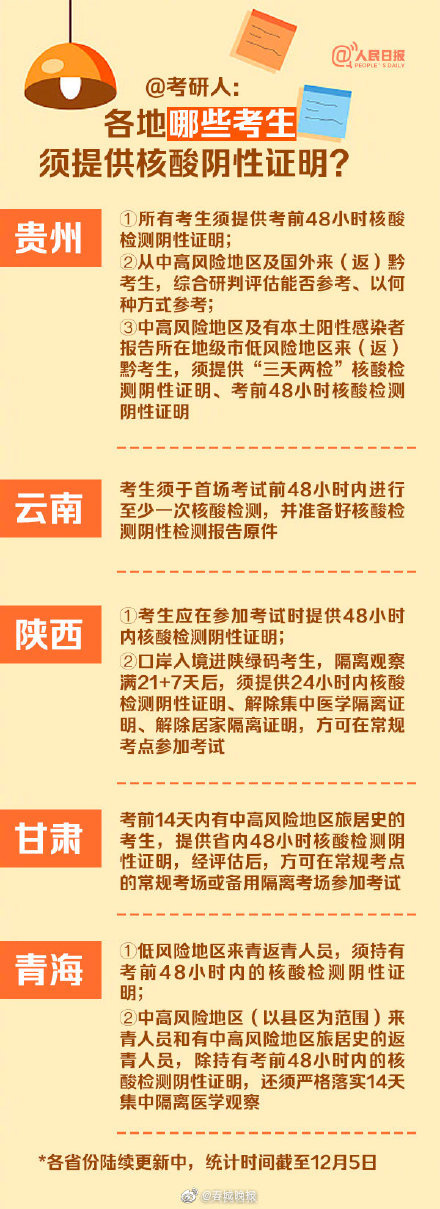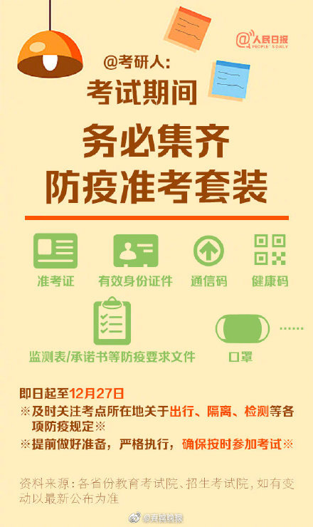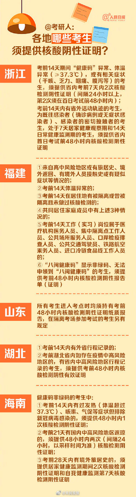 日前#多省份公布2022考研防疫要求#:保持健康码、行程卡绿码,考前14天起非必要不流动、打卡或填写健康监测信息,特别是#多省份提醒考研前48小时内做核酸#,并提出具体要求。哪些考生需要做核酸?#考研人的防疫准考套装#↓↓转存对照准备,预祝考研成功!网页链接(@人民日报 )