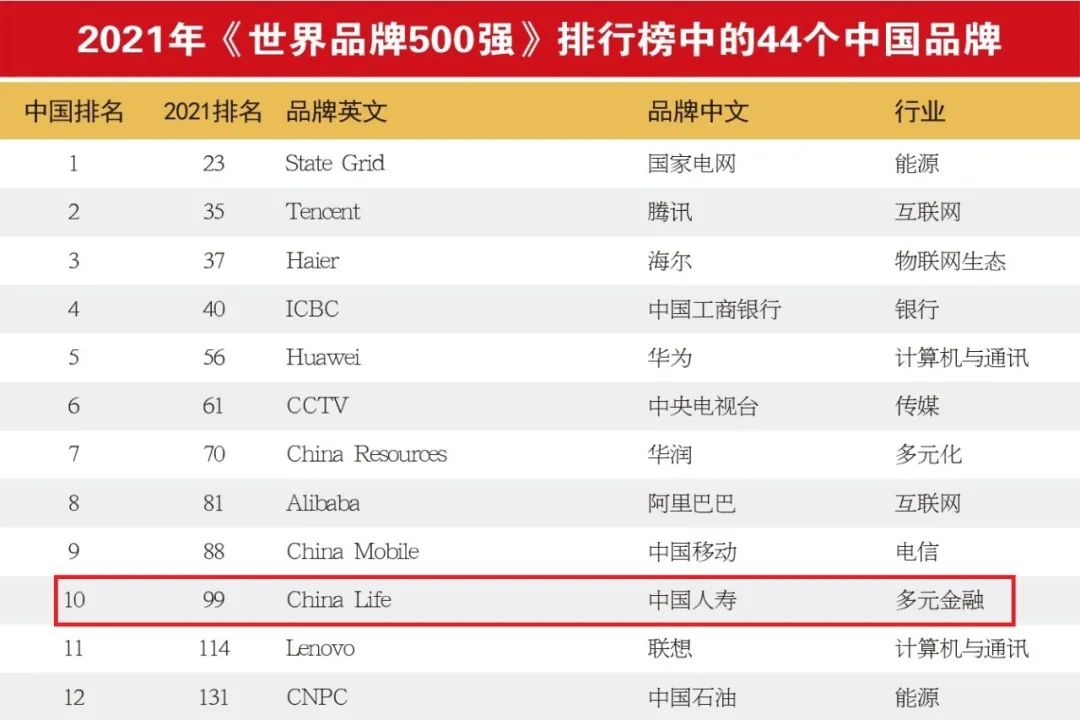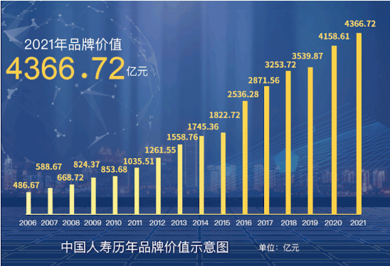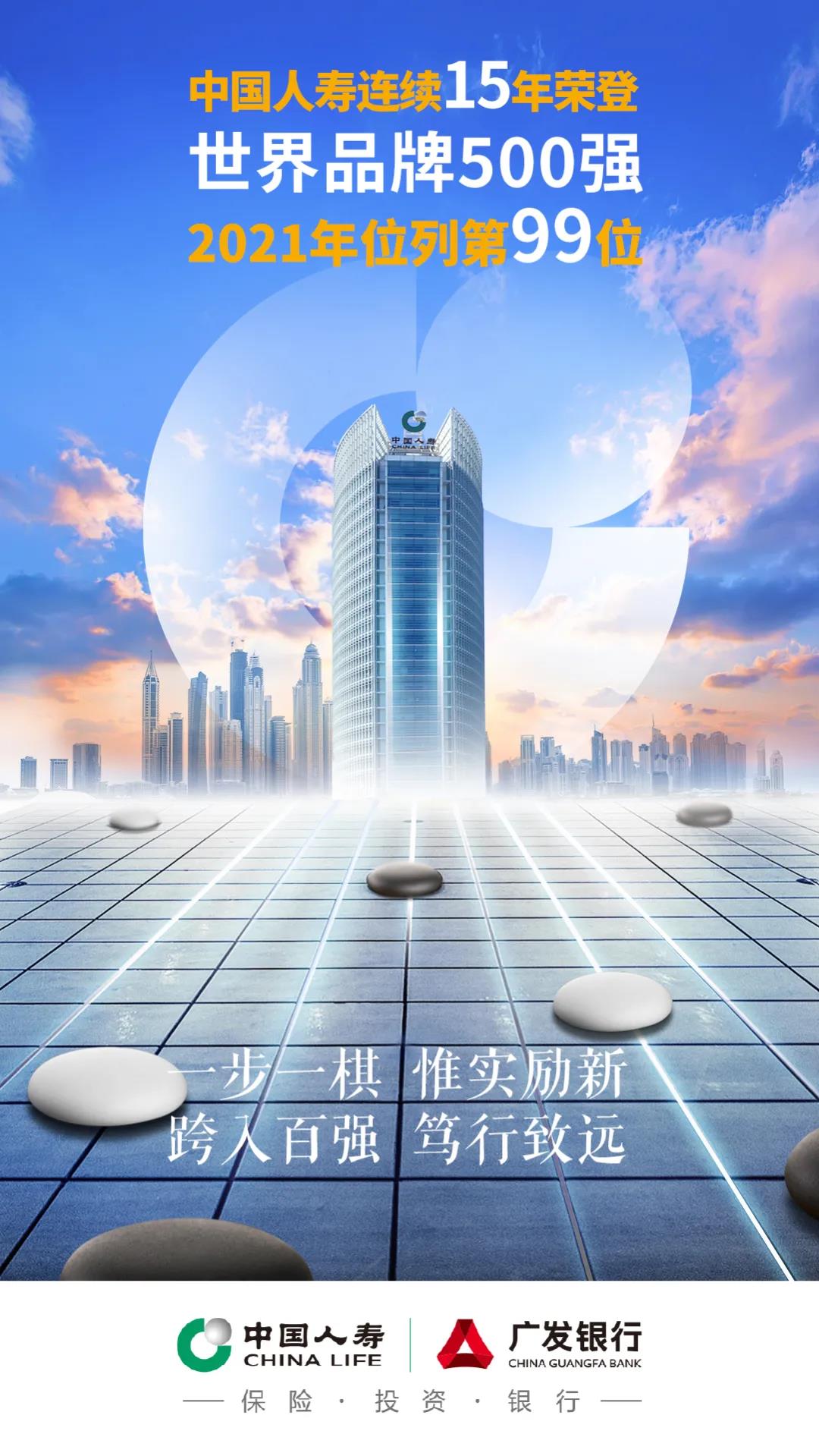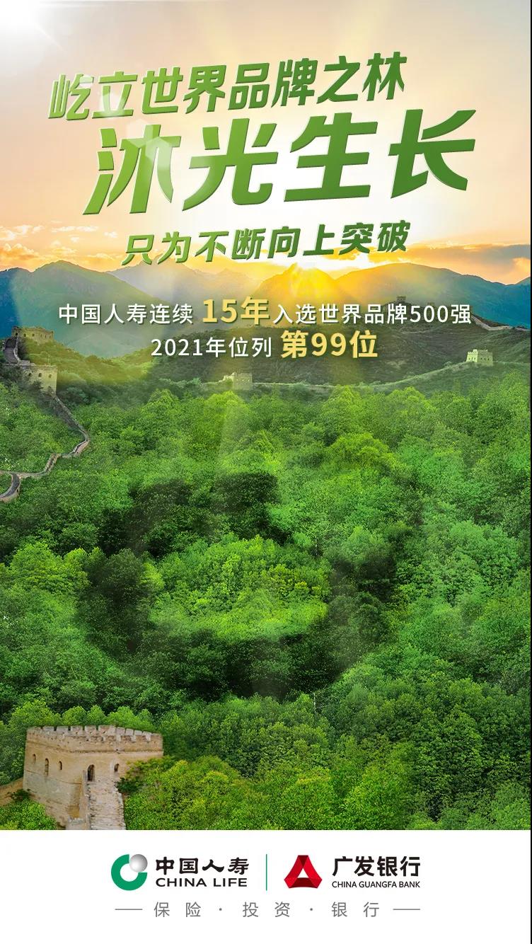 中国人寿始终笃信笃行品牌创造价值理念,创新开展品牌综合化、科技化、国际化、年轻化形象建设,致力推进战略落地、支撑集团管控、驱动业务发展。根据世界品牌实验室发布的2021年中国500最具价值品牌榜单,中国人寿品牌价值高达人民币4366.72亿元,在中国金融保险行业中蝉联第一。此前,中国人寿已经连续19年入选《财富》世界500强排行榜,2021年位列第32位。