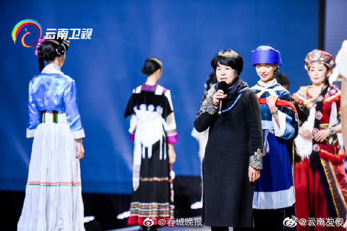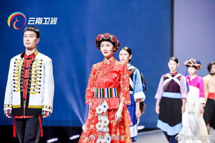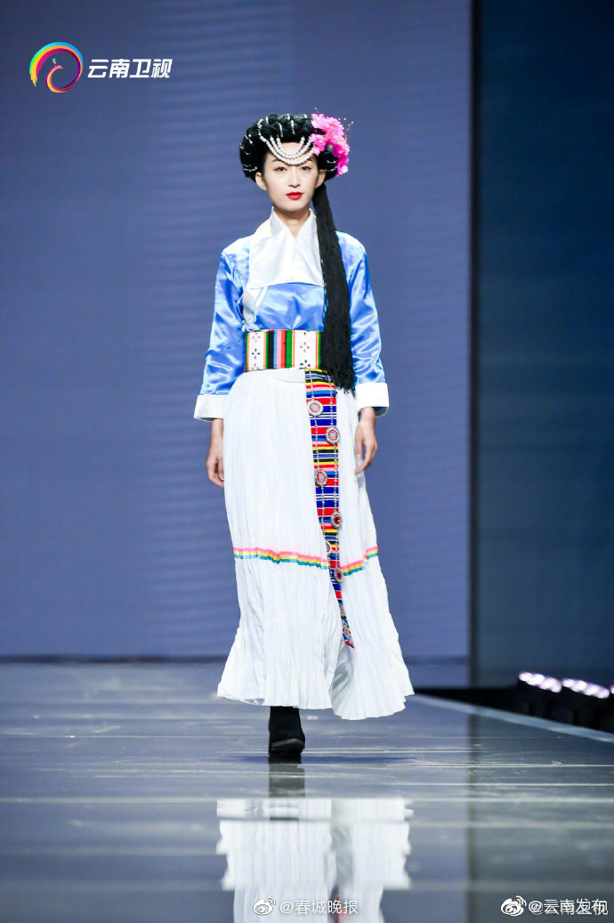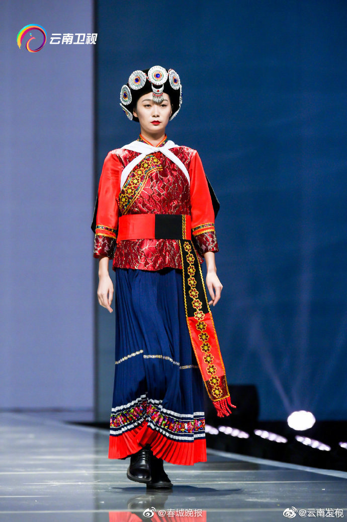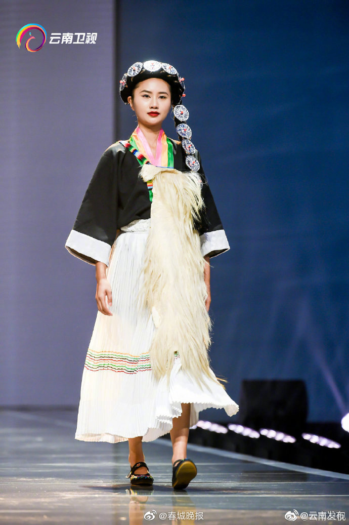丽江/保山/怒江/玉溪/曲靖特色精品民族服饰展演专场秀,丽江市古城区憩园布艺有限公司带来了纳西族特色精品服饰秀《披星戴月》,纳西族女子上身着长过膝盖的大褂,宽腰大袖,腰系百褶围腰,下着长裤,背披披肩。这种披肩是用整张绵羊皮去毛、洗净、硝白缝制而成。羊皮光面上部横镶一道黑色氆氇或者毛呢,再钉上一字横排的7块圆形彩绣布盘,在7块圆形布盘之上还有左右两块大的圆盘,分别象征着太阳和月亮。#2021线上昆明民族时装周#(@云南卫视 )