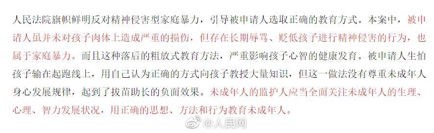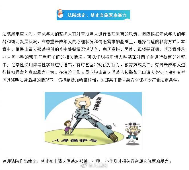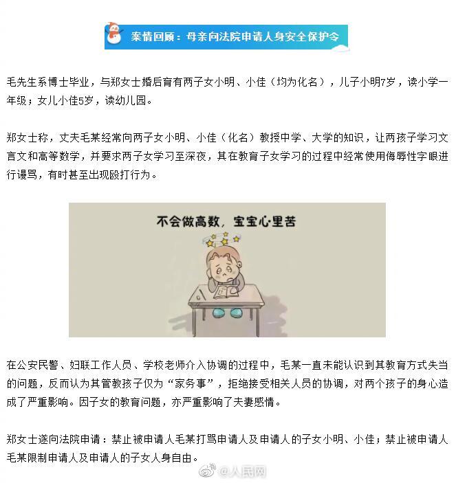 爸爸逼年幼子女学高数妈妈申保护令毛先生博士毕业,与郑女士婚后育有一子一女,儿子小明7岁,女儿小佳5岁。郑女士称,丈夫毛某常向两子女小明、小佳教授中学、大学的知识,让两孩子学文言文和高等数学,并要求孩子学习至深夜,其在教育子女学习的过程中经常使用侮辱性字眼进行谩骂,有时甚至出现殴打行为。郑女士向法院申请人身安全保护令。法院:禁止被申请人毛某对郑某、小明、小佳及其相关近亲属实施家庭暴力。(南京中院)