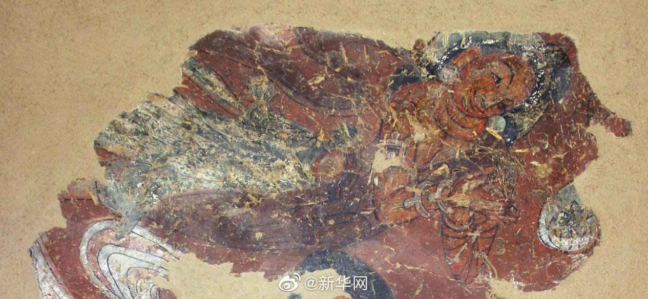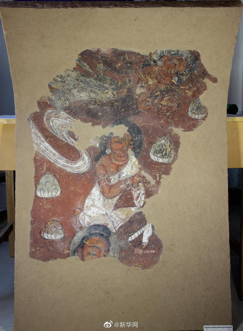 记者15日从甘肃省武威市天梯山石窟保护研究所了解到,敦煌研究院在对天梯山石窟进行搬迁壁画彩塑修复过程中,发现一幅完整的北凉飞天壁画。