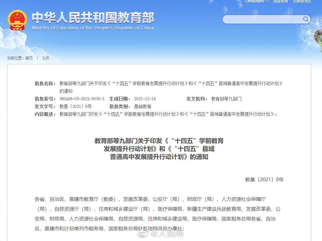 16日,教育部等九部门发布“十四五”学前教育发展提升行动计划:①到2025年,全国学前三年毛入园率将达到90%以上,普惠性幼儿园覆盖率达到85%以上,公办园在园幼儿占比将超50%;②#幼儿园有虐童等行为年检一票否决#;③幼儿教师实施全员培训,保障幼儿教师工资待遇 。