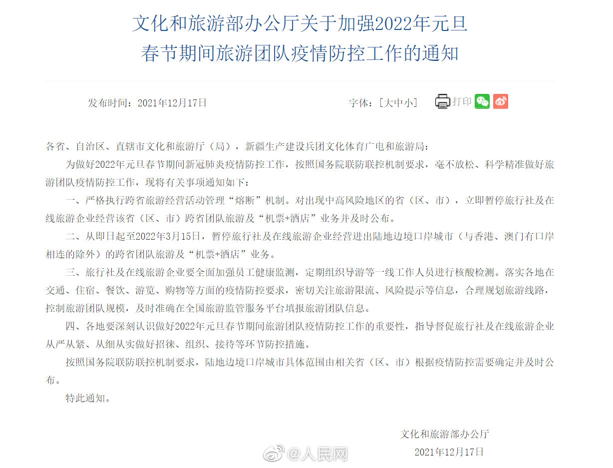 12月17日,文化和旅游部发布通知,要求严格执行跨省旅游经营活动管理“熔断”机制。对出现中高风险地区的省(区、市),立即暂停旅行社及在线旅游企业经营该省(区、市)跨省团队旅游及“机票+酒店”业务并及时公布。从即日起至2022年3月15日,暂停旅行社及在线旅游企业经营进出陆地边境口岸城市(与香港、澳门有口岸相连的除外)的跨省团队旅游及“机票+酒店”业务。