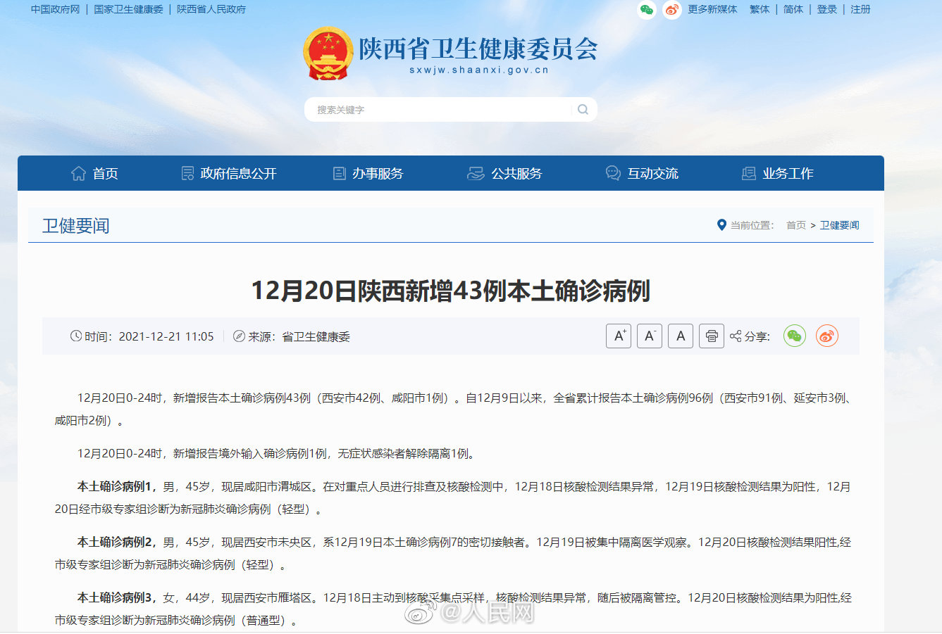 12月20日0-24时,#陕西12月20日新增43例本土确诊#(西安市42例、咸阳市1例)。自12月9日以来,陕西省累计报告本土确诊病例96例(西安市91例、延安市3例、咸阳市2例)。