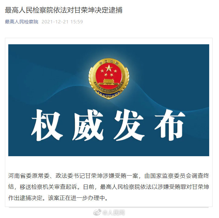 据最高人民检察院消息:河南省委原常委、政法委书记甘荣坤涉嫌受贿一案,由国家监察委员会调查终结,移送检察机关审查起诉。日前,最高人民检察院依法以涉嫌受贿罪对甘荣坤作出逮捕决定。该案正在进一步办理中。(人民网)