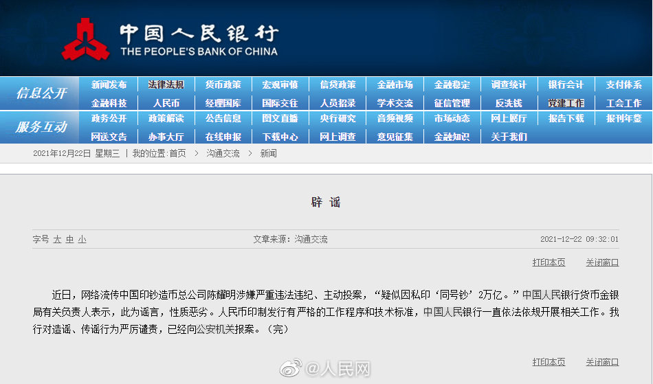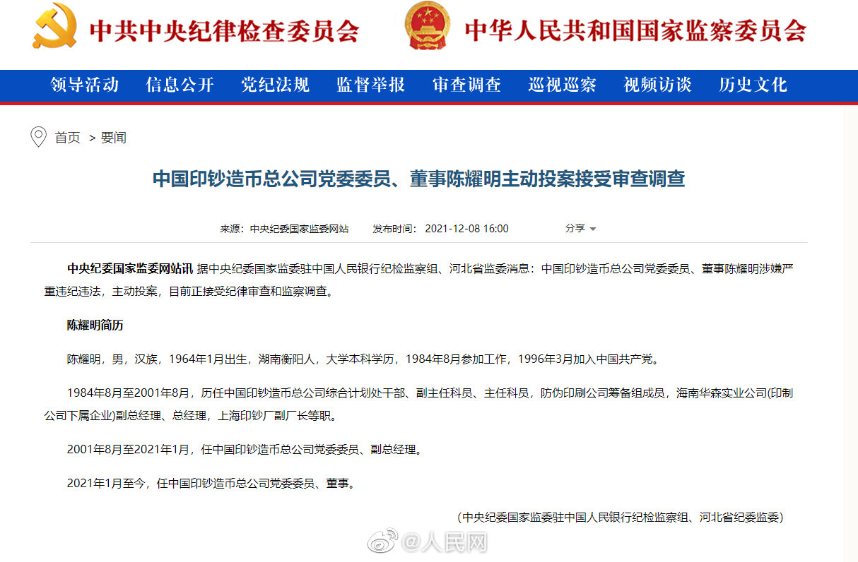 12月8日,中央纪委国家监委网站通报:中国印钞造币总公司党委委员、董事陈耀明涉嫌严重违纪违法,主动投案,目前正接受纪律审查和监察调查。12月22日,针对“网传陈耀明因私印‘同号钞’2万亿被查”消息,中国人民银行货币金银局有关负责人表示,此为谣言,性质恶劣。人民币印制发行有严格的工作程序和技术标准,中国人民银行一直依法依规开展相关工作。我行对造谣、传谣行为严厉谴责,已经向公安机关报案。