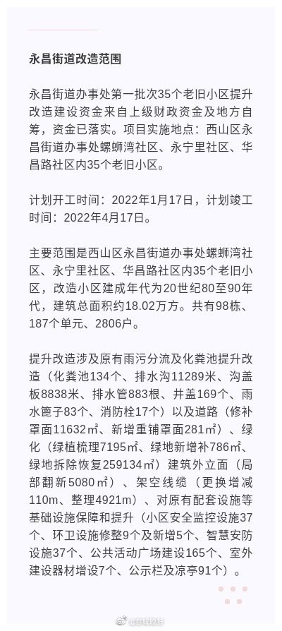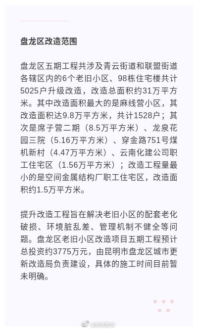近日,昆明盘龙区发展和改革局发布关于“盘龙区老旧小区改造项目五期工程可行性研究报告”的批复。涉及6个老旧小区、98栋住宅楼升级改造。加上昆明市西山区人民政府永昌街道办事处第一批次35个老旧小区提升改造。昆明近期确定将有41个老旧小区进行改造。改造范围↓↓