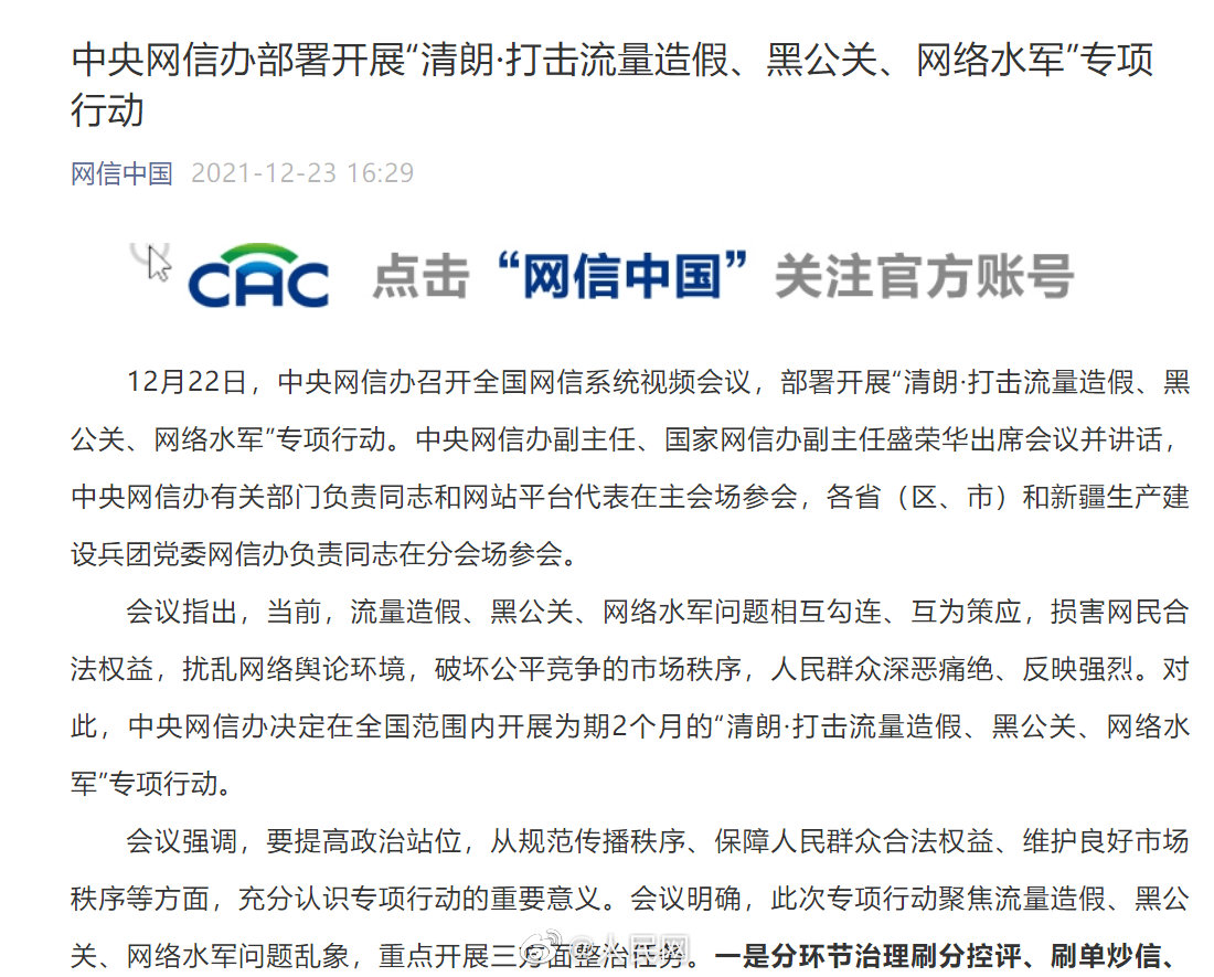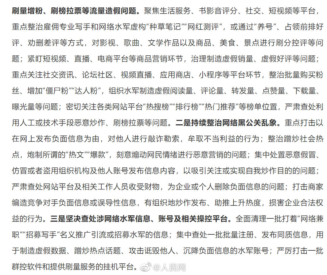 中央网信办部署开展“清朗·打击流量造假、黑公关、网络水军”专项行动