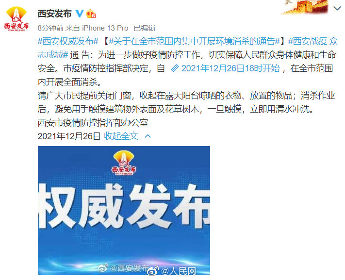 据@西安发布:自12月26日18时开始,西安市开展全面消杀。#西安全面消杀请提前关闭门窗#,收起在露天阳台晾晒的衣物、放置的物品;消杀作业后,避免用手触摸建筑物外表面及花草树木,一旦触摸,立即用清水冲洗。