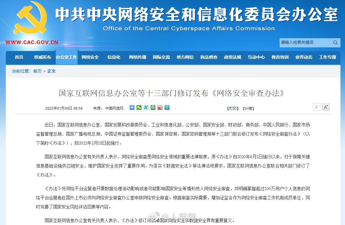 近日,国家互联网信息办公室等十三部门联合修订发布《网络安全审查办法》,自2022年2月15日起施行。《办法》将网络平台运营者开展数据处理活动影响或者可能影响国家安全等情形纳入网络安全审查,并明确掌握超过100万用户个人信息的网络平台运营者赴国外上市必须向网络安全审查办公室申报网络安全审查。详戳→