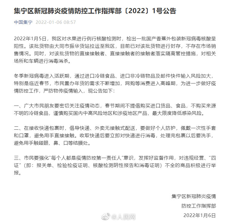 1月5日,内蒙古乌兰察布集宁区对水果进行例行核酸检测时,检出一批国产香蕉外包装新冠病毒核酸呈阳性。该批货物由大同市振华货站拉运至集宁区,目前已对该批货物进行封存,不存在市场销售情况。同时,对该批货物的直接接触者、直接接触者的接触者落实隔离管控措施,对相关场所和车辆进行消毒消杀。