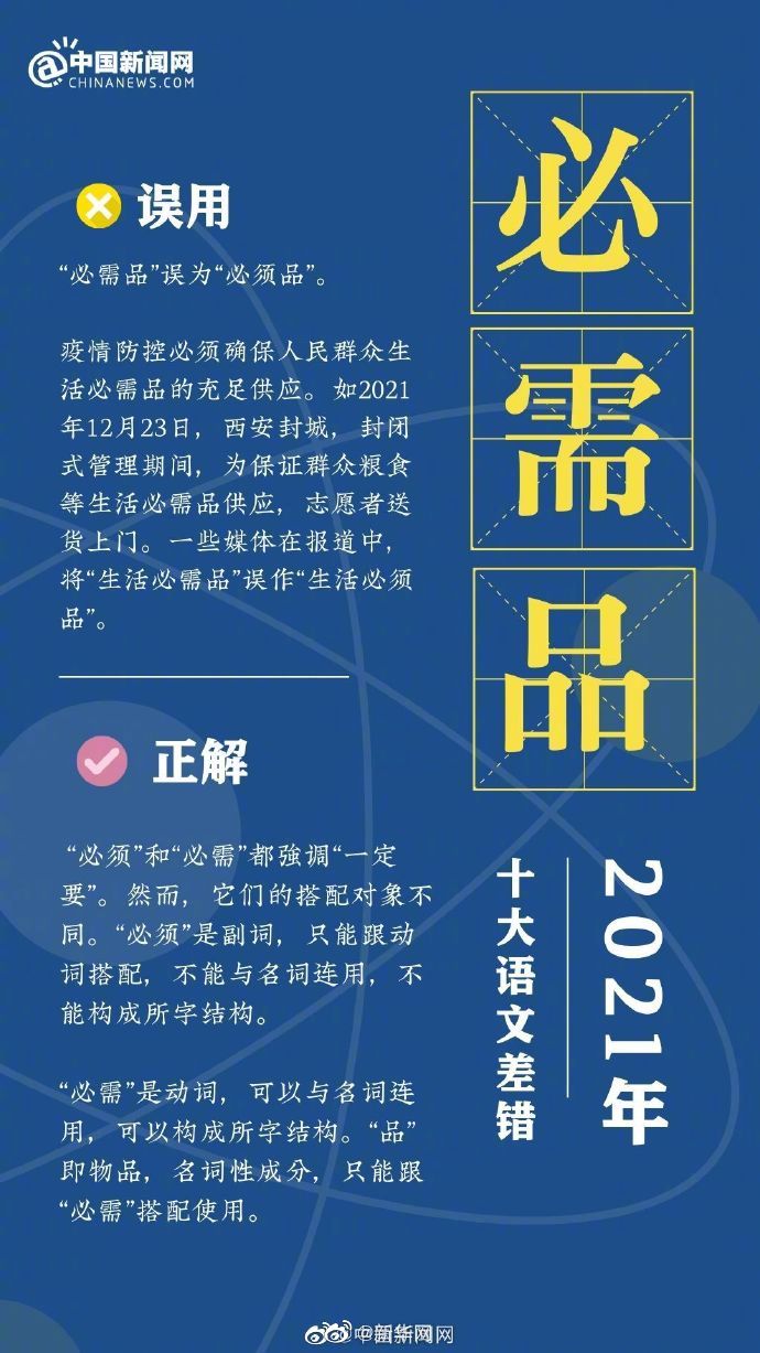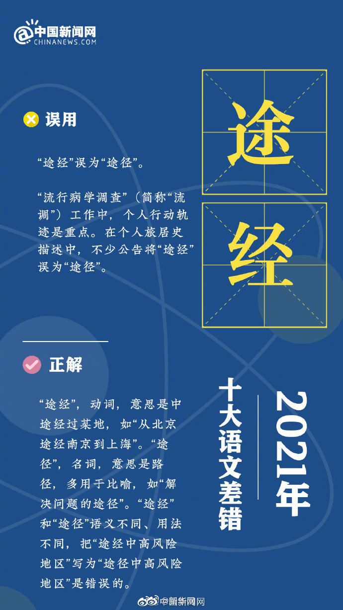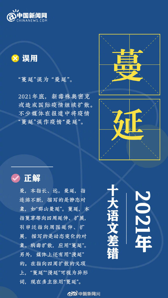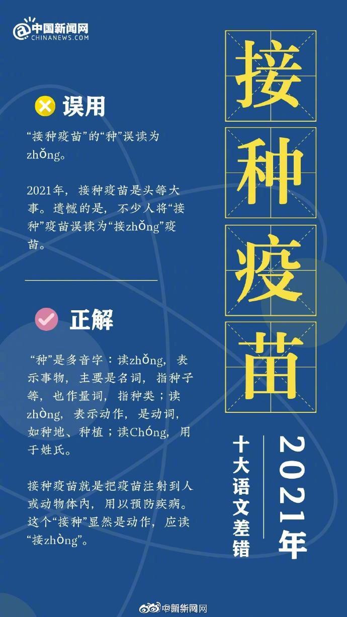十大语文差错你错过几个?《咬文嚼字》编辑部发布2021年十大语文差错:①“六安”的“六”误读为liù;②“蔓延”误为 “曼延”;③ “接种疫苗”的“种”误读为zhǒng;④“途经”误为“途径”;⑤“必需品”误为“必须品”;⑥“赓续”误为“庚续”;⑦“失之偏颇”误为“有失偏颇”;⑧“血脉偾张”误为“血脉喷张”;⑨“情结”误为“情节”;⑩“行拘”误为“刑拘”。(中国新闻网)