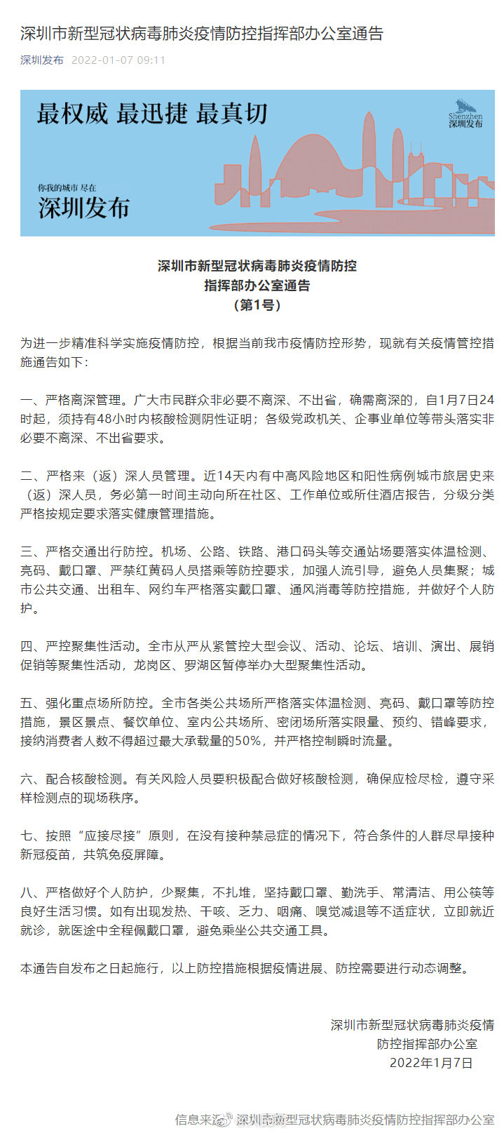 1月7日,#深圳报告新冠阳性感染者2例#。深圳市新冠肺炎疫情防控指挥部办公室当天通告,要求广大市民群众非必要不离深、不出省,确需离深的,自1月7日24时起,须持有48小时内核酸检测阴性证明。@人民网广东频道