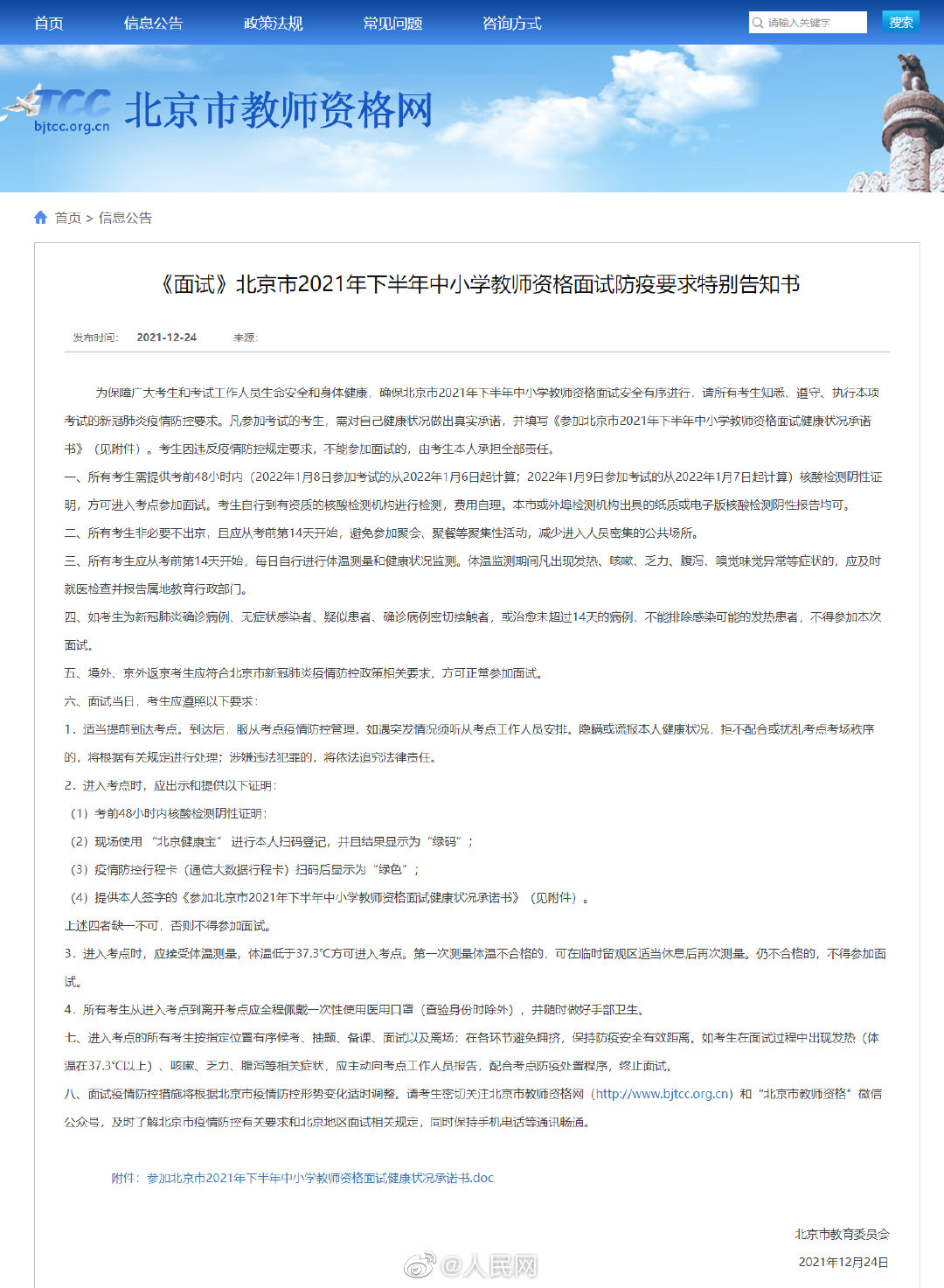 2021年下半年中小学教师资格考试面试将于1月8日至9日举行。北京市教委日前发布《北京市2021年下半年中小学教师资格面试防疫要求特别告知书》,要求考生持考前48小时核酸阴性证明参加考试。