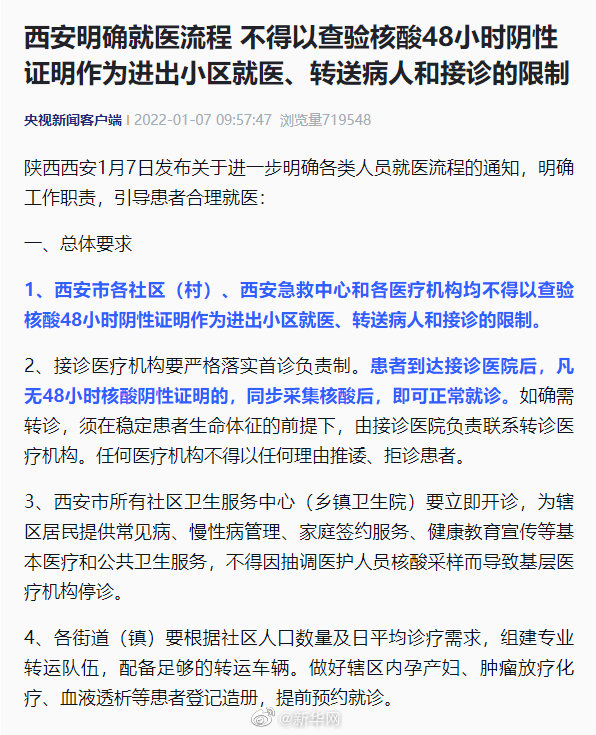 今天,陕西西安发布关于进一步明确各类人员就医流程的通知,明确工作职责,引导患者合理就医。(央视新闻)