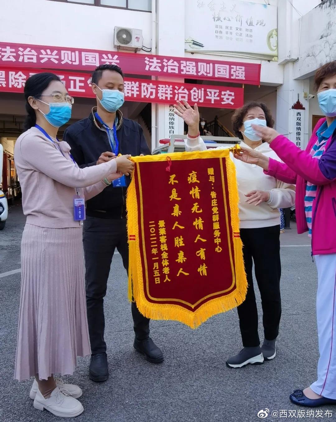 1月5日下午,一群来自湖北武汉六七十岁的旅客,把一面印有“疫情无情人有情,不是亲人胜亲人”的锦旗,送到景洪市江北街道办事处告庄党群服务中心,以表达在疫情防控期间对他们无微不至的关心和照顾。