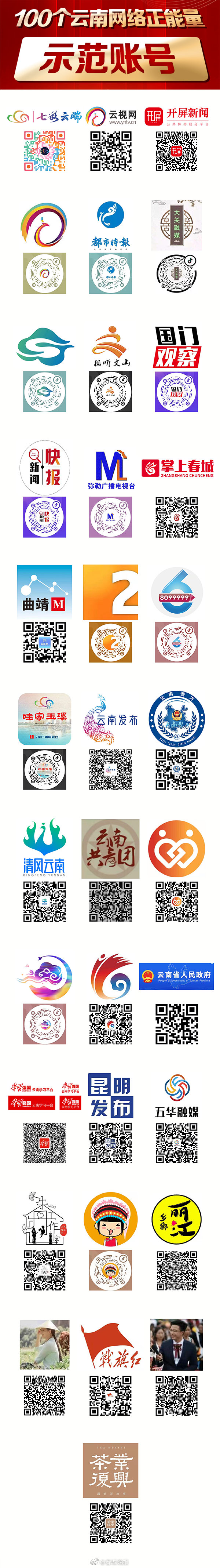 2021年云南网络正能量“五个一百”征集展播活动中,开屏新闻客户端、“春城晚报”微博等账号入选“100个云南网络正能量传播示范账号”。一个个网络平台和账号背后是千千万万奋斗的云南儿女!一批批网络正能量作品通过这些平台和账号得以展现,也是通过这些网络“窗口”,让我们看到云南奋力书写的答卷!迈步在新时代的征程上,这些平台和账号星火熠熠,在网络空间汇聚起正能量之光,声情并茂,向社会传递云南好声音;蓬勃向上,共建网上网下同心圆!