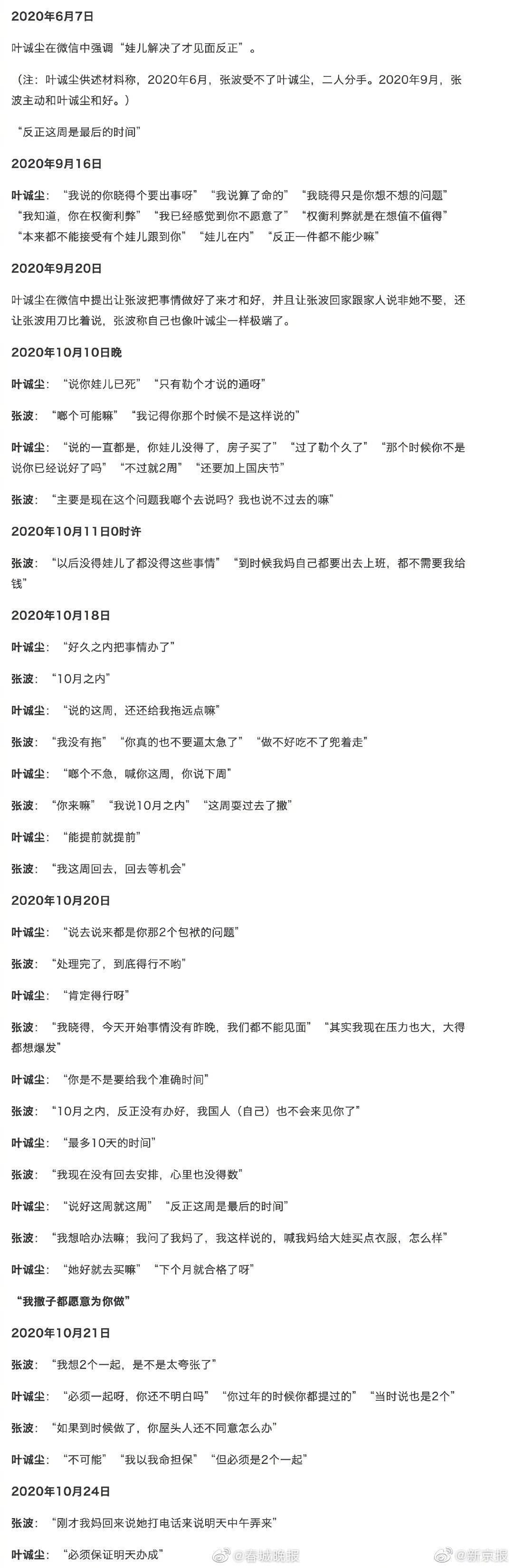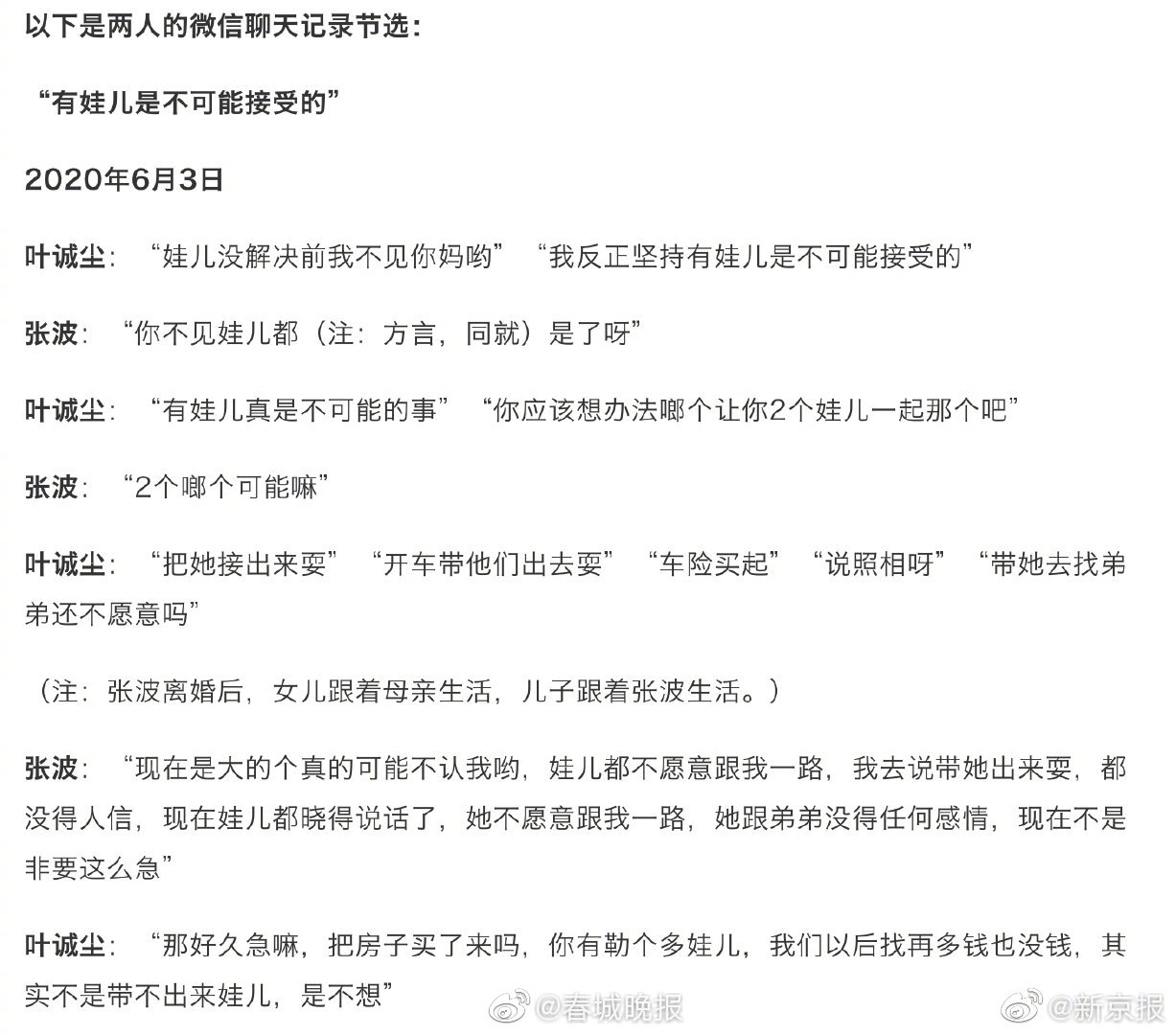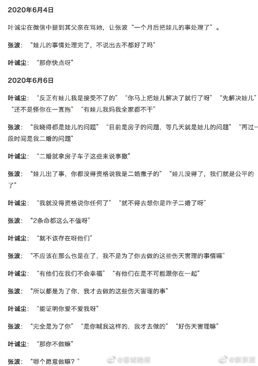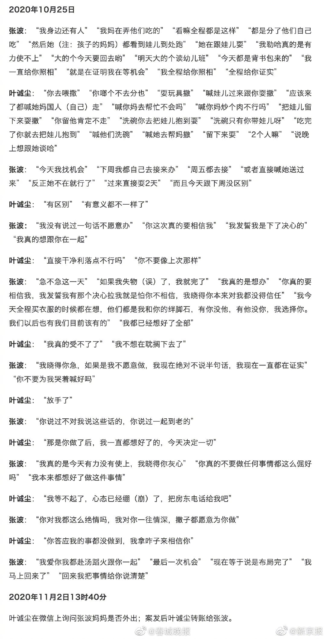 张波将两个孩子从楼上扔下的时间是2020年11月2日。澎湃日前从相关渠道获得了张波、叶诚尘2020年6月3日至11月2日的与案件相关的聊天记录,这些经公安机关依法收集、法院认为“内容客观真实,与本案具有关联性,证据间能相互印证,形成锁链并予以采信”的信息,详细记录下张波、叶诚尘共谋作案的过程,以及张波的心理变化轨迹。(@新京报 )
