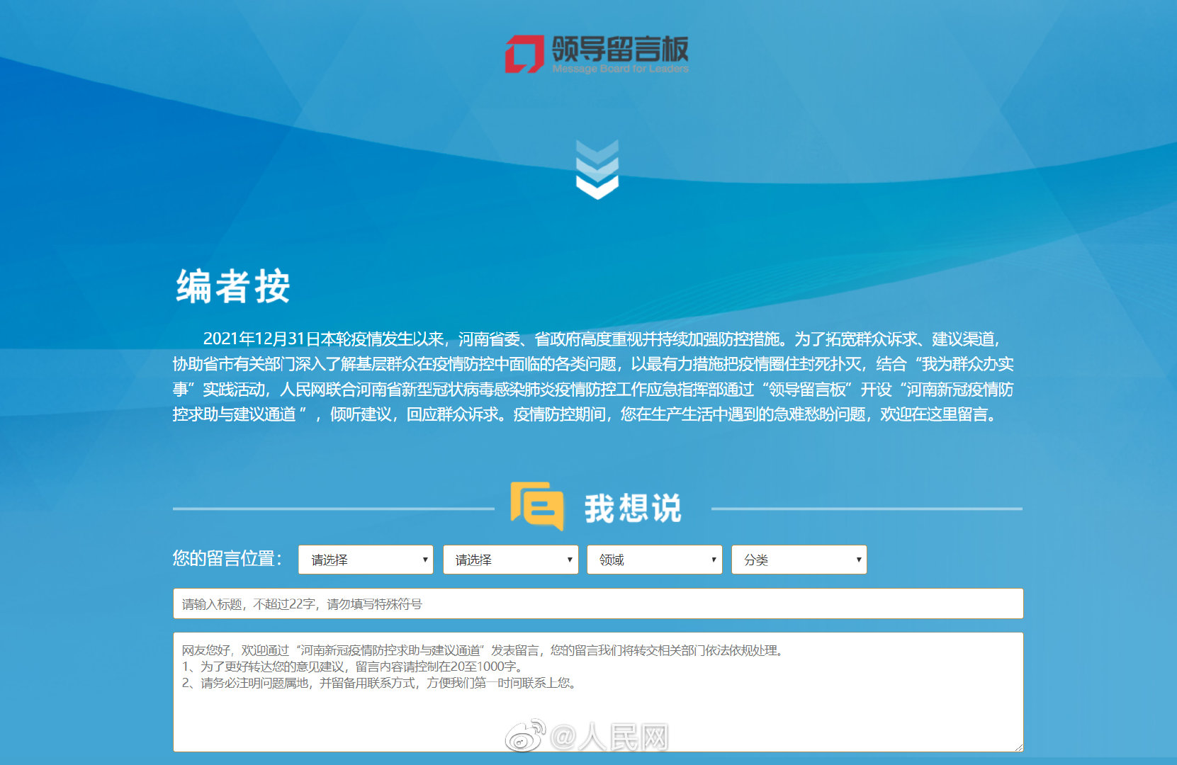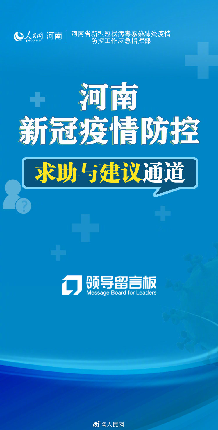 即日起,河南省新冠肺炎疫情防控工作应急指挥部与人民网通过@领导留言板 联合开设#河南新冠疫情防控求助与建议通道#。疫情防控期间,如果您在生产生活中遇到任何问题,欢迎随时来这里留言→网页链接,我们会第一时间将您的问题反馈给有关部门。@人民网河南频道