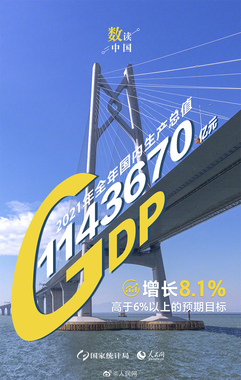 2021年国内生产总值(GDP)1143670亿元 比上年增长8.1%