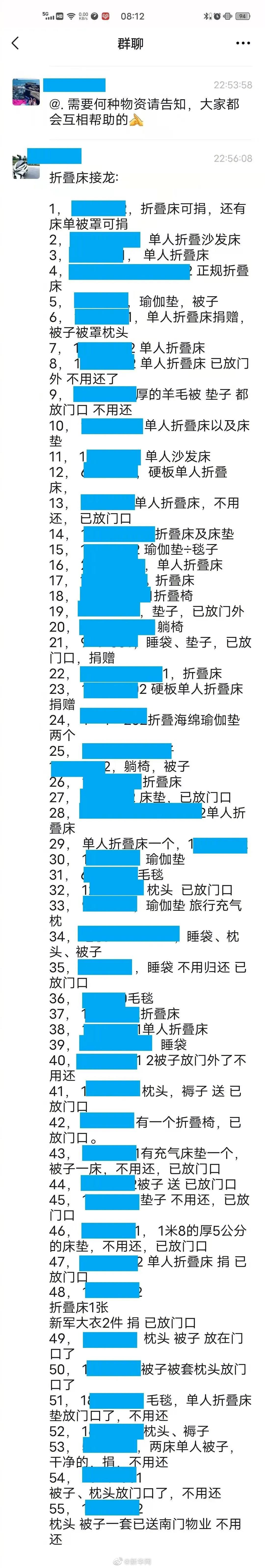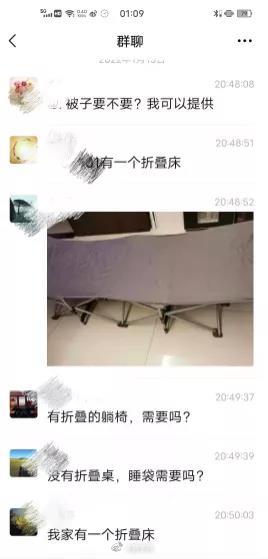 北京海淀居民给抗疫物业员工捐被褥“我有折叠床一个,不用还,放门口了;我有充气床垫一个,被子一床,不用还,已放门口……”1月15日晚上10点多,这样的接龙在北京涉疫情小区“博雅西园和谐议事”微信群里继续。
