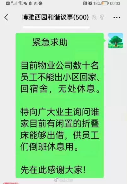在北京海淀区突发疫情的那个晚上,短短2个小时就有上百位居民为坚守岗位的物业员工捐赠折叠床、被褥枕头。1月15日9时50分,接第三方检测机构报告一例新型冠状病毒肺炎核酸检测初筛阳性后,社区物业员工积极投入到疫情防控中。忙碌到晚上8点多,物业员工们才忽然反应过来,自己出不去小区了,晚上在哪儿休息成了难题。热心居民紫苏(微信名)了解到了这个情况,主动提出要在居民中募集折叠床。