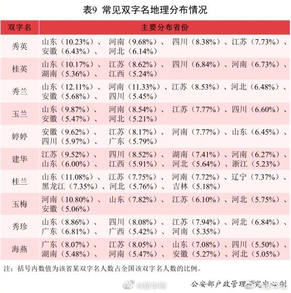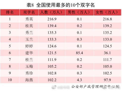 公安部户政管理研究中心24日发布2021年全国姓名报告。全国户籍人口中,使用频率最高的10个双字名依次为:秀英、桂英、秀兰、玉兰、婷婷、建华、桂兰、玉梅、秀珍、海燕。其中“秀英”名列榜首,使用人数为216.9万。男性使用较多的双字名仅有“建华”;其余常见双字名为女性使用较多,重名率明显高于男性。5.24%的“桂英”分布在江西;5.79%的“婷婷”、6.81%的“秀珍”、8.07%的“海燕”分布在广东;5.91%、5.23%的“建华”分布在江西和浙江;7.37%、7.35%、5.18%的“桂兰”分布在辽宁、黑龙江和吉林;5.42%的“秀珍”分布在广西。