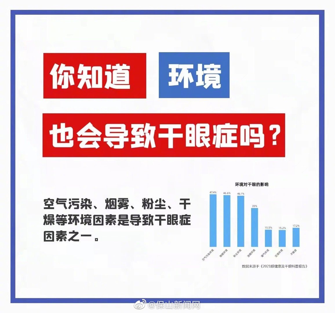 ③空气污染、烟雾、粉尘等环境因素对干眼症也有一定的影响;