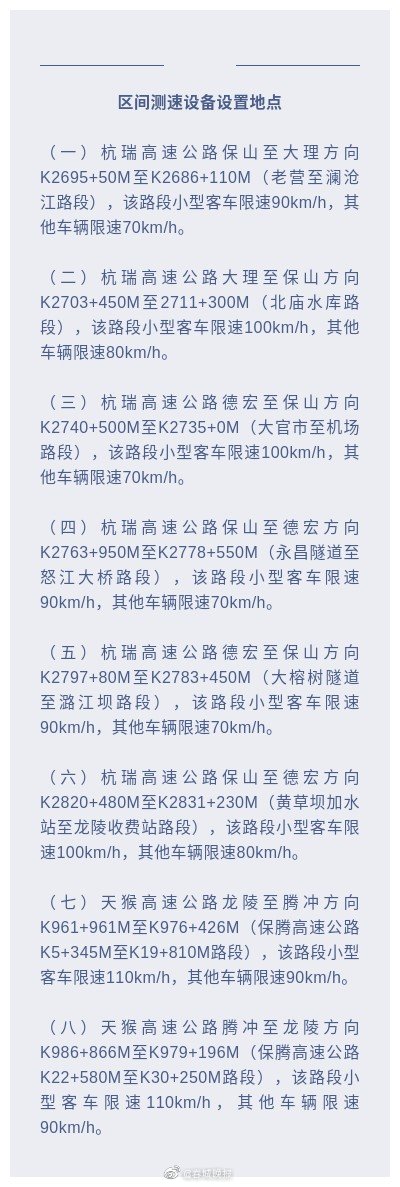 1月30日起,杭瑞高速天猴高速保山段将启用8套区间测速设备