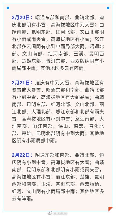 受冷空气和南支槽影响,预计2月19-22日云南大部将出现一次降温降水天气过程:滇中及以东以南日最高气温下降8~10℃,局地12~14℃;滇中日最高气温将降至6~8℃,最低气温降至2~4℃;滇东日最高气温将降至1~3℃,最低气温-5~0℃。迪庆有中到大雪,高海拔地区有暴雪或大暴雪;昭通东部和南部、曲靖北部有小到中雪,高海拔地区有大到暴雪;滇中东部、滇东南北部有雨夹雪或小雪。
