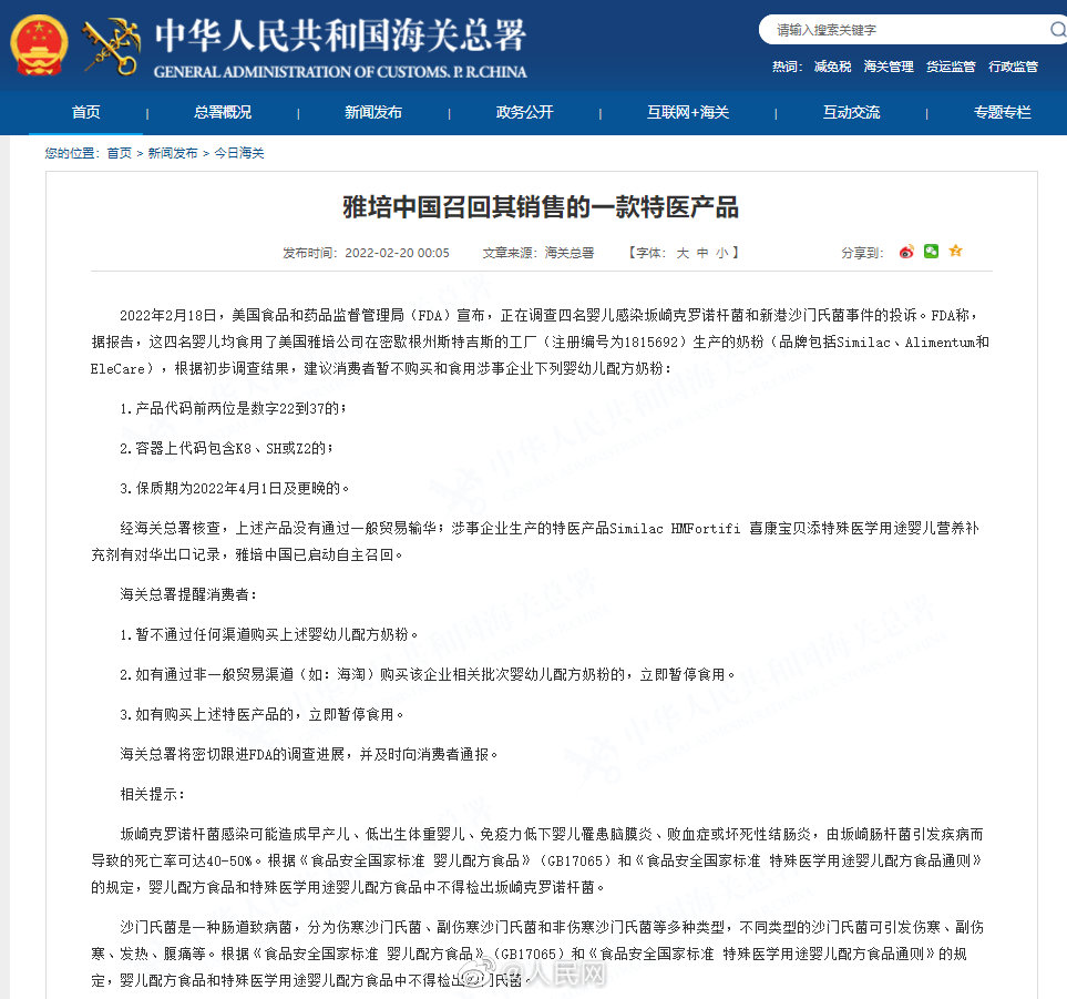 2月20日,海关总署发布公告,提醒消费者“暂不通过任何渠道购买”以及“立即暂停食用”美国雅培公司旗下相关婴幼儿配方奶粉。公告显示,2月18日,美国食品和药品监督管理局(FDA)宣布,正在调查四名婴儿感染克罗诺杆菌和沙门氏菌事件的投诉。FDA称,据报告,这四名婴儿均食用了雅培在密歇根州斯特吉斯工厂生产的奶粉,品牌包括Similac、Alimentum和EleCare...详细↓↓