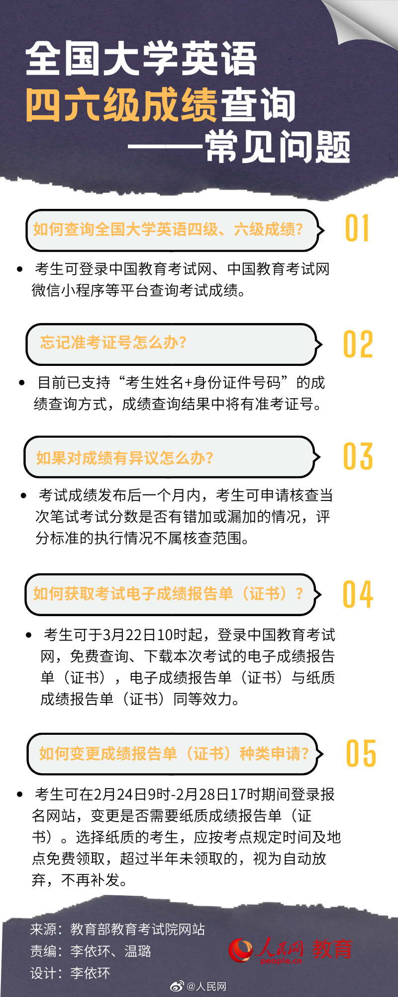 2021年下半年全国大学英语四、六级考试(CET)成绩查询服务将于今天上午10时开通,考生可登录中国教育考试网(网页链接)等平台查询考试成绩。#四六级成绩查询常见问题#↓↓以供参考。祝大家过!过!过!(人民网)