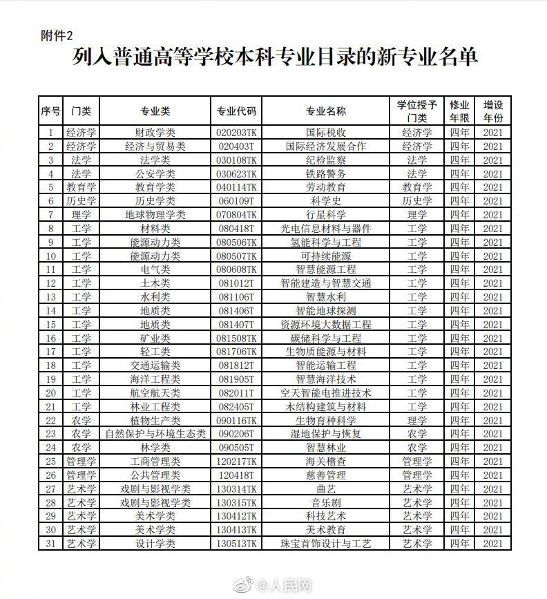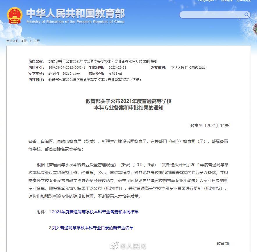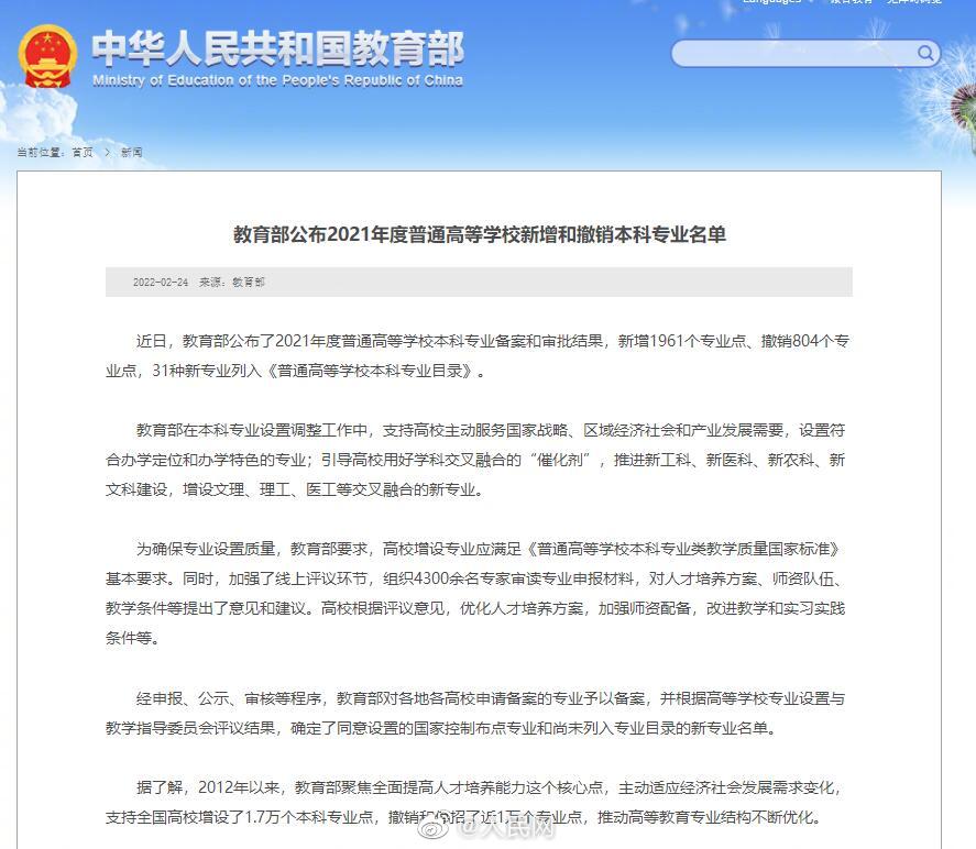 日前,教育部公布了2021年度普通高等学校本科专业备案和审批结果,其中新增专业点1961个、撤销专业点804个,#31种新专业列入本科专业目录#,本次备案、审批和调整的专业点,将列入相关高校2022年本科招生计划。详戳→
