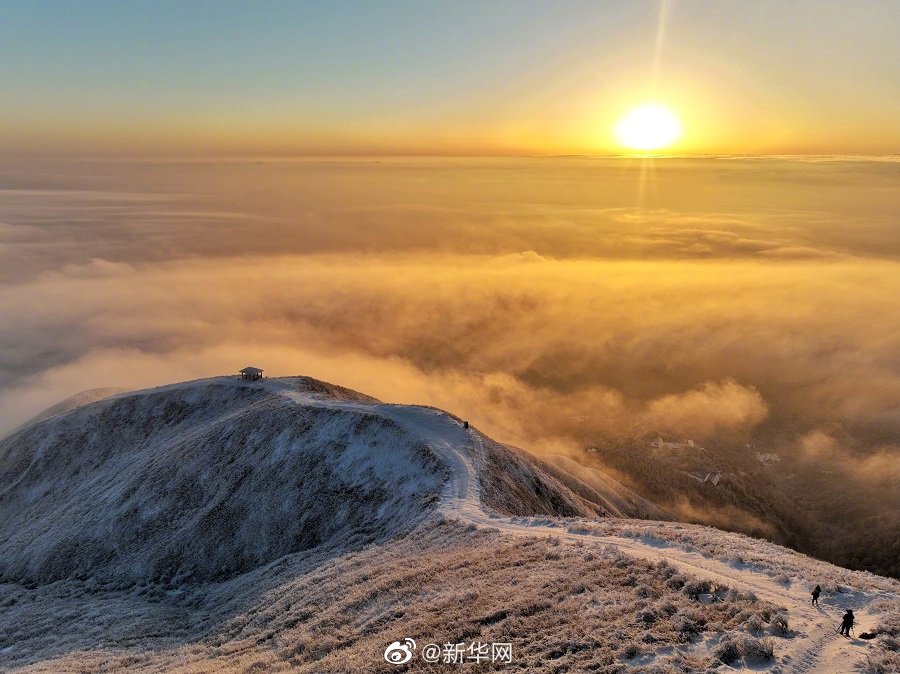 2月24日,江西萍乡武功山雪后初霁,出现日出云海景观,美如仙境。一轮红日在天际冉冉升起,远处的云海都像被镶上了金边。