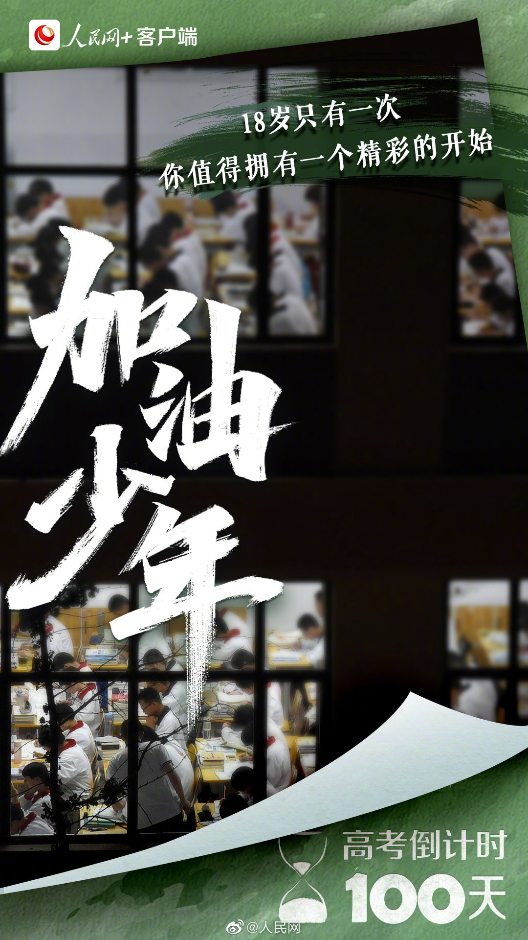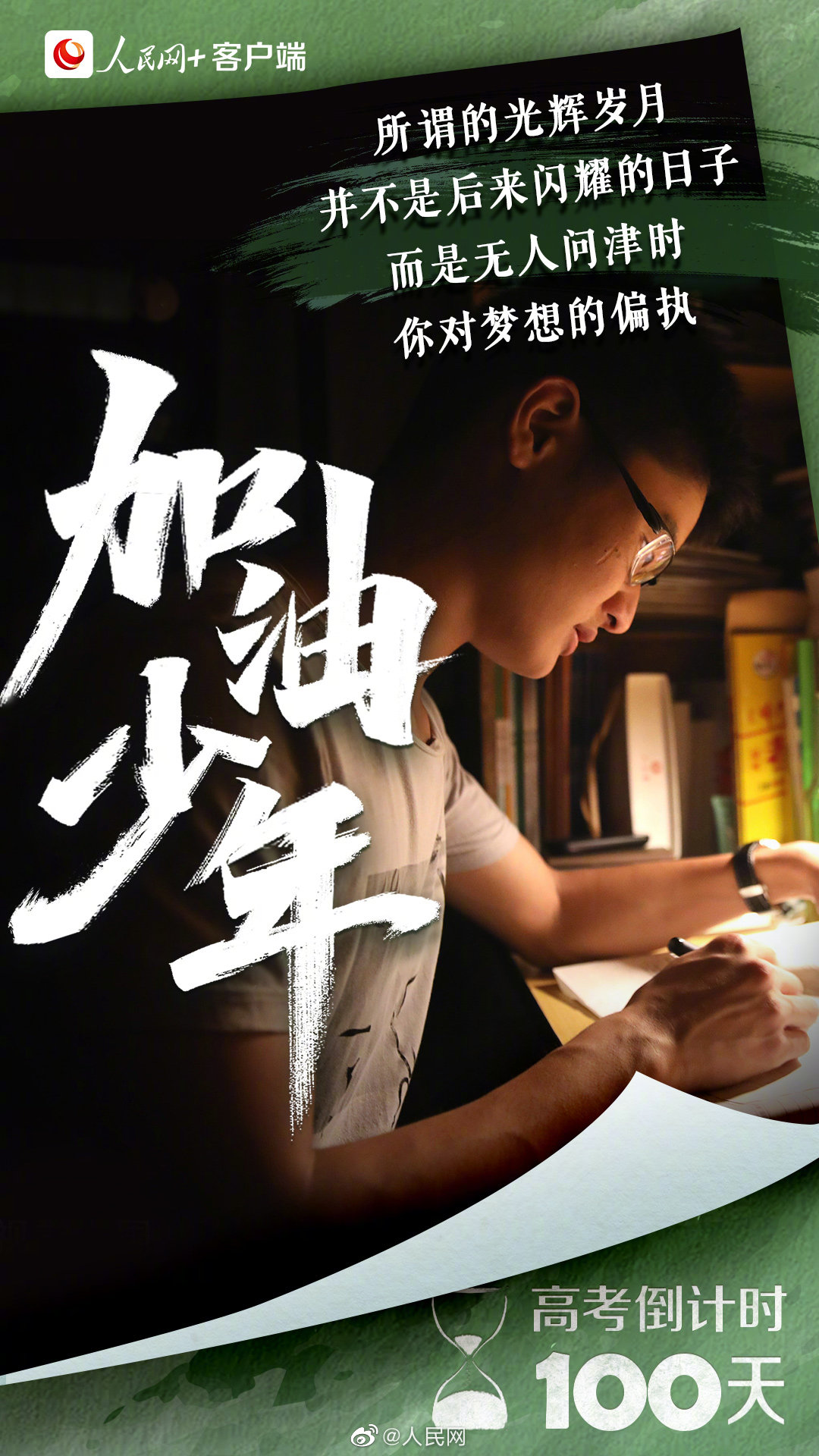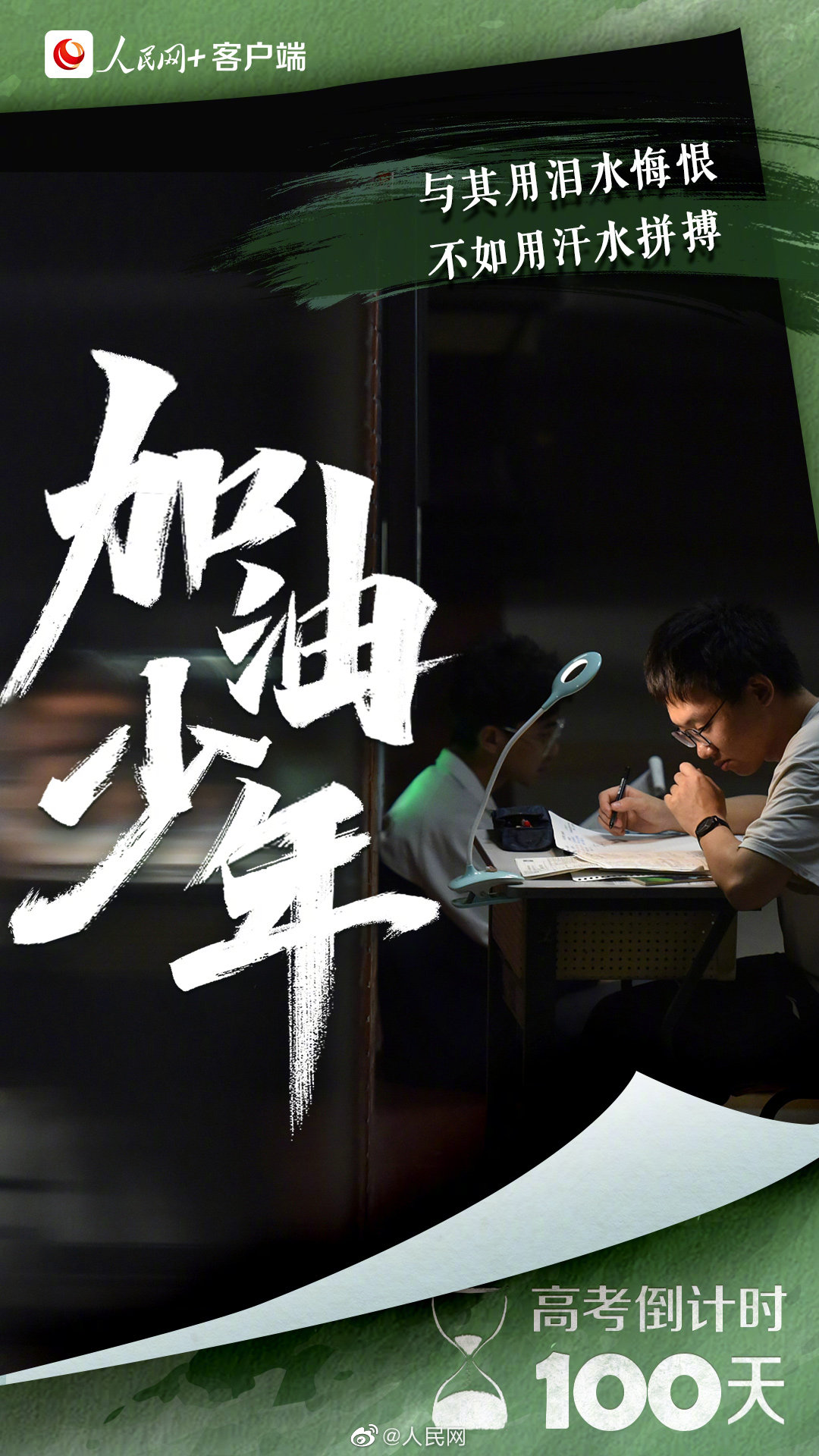 为高考你有多拼?无数个清晨,你诵读出青春的朝气蓬勃;多少个深夜,你书写下少年的拼搏不息。每个为梦想拼尽全力、坚持到底的你,都是好样的!请相信,你所有的付出,都将变成未来的礼物。#2022高考倒计时一百天#,加油吧,少年!(“人民网+”客户端)