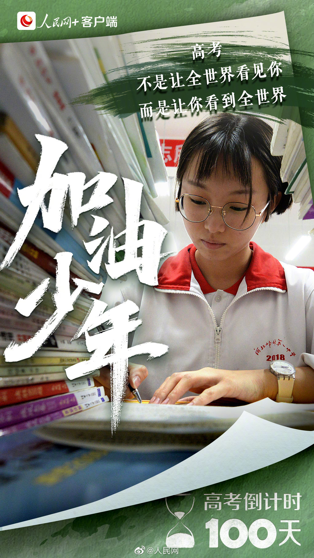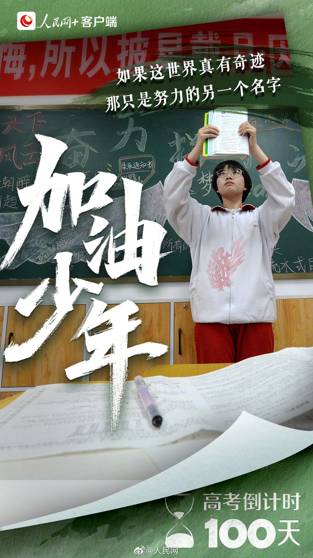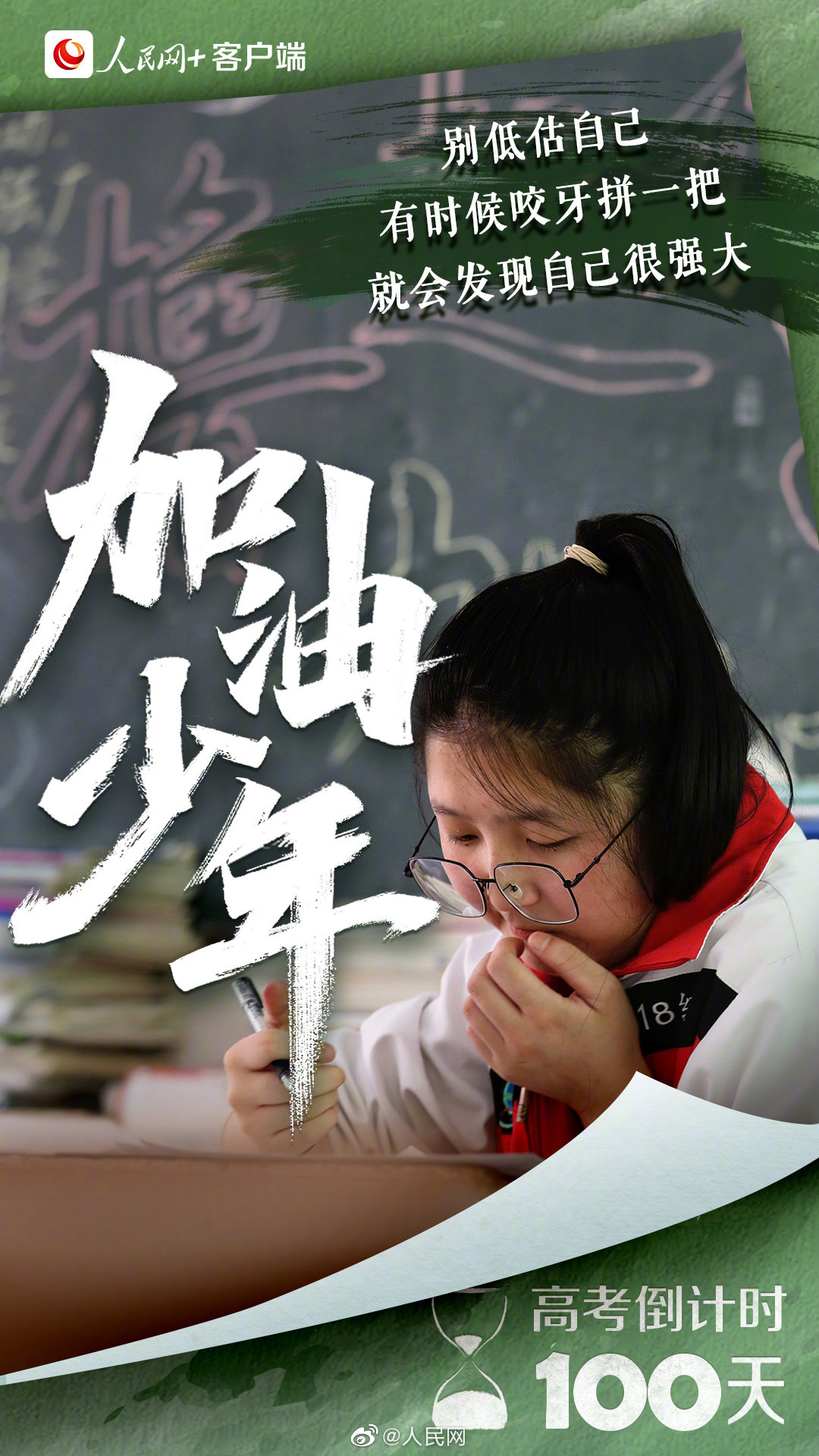 为高考你有多拼?无数个清晨,你诵读出青春的朝气蓬勃;多少个深夜,你书写下少年的拼搏不息。每个为梦想拼尽全力、坚持到底的你,都是好样的!请相信,你所有的付出,都将变成未来的礼物。#2022高考倒计时一百天#,加油吧,少年!(“人民网+”客户端)