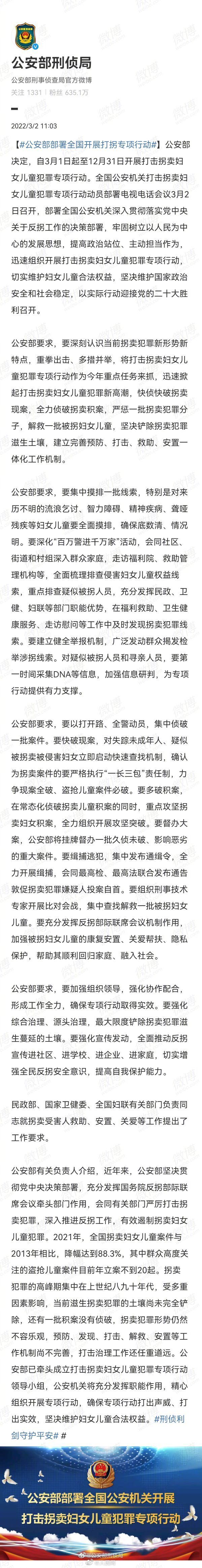 公安部决定,自3月1日起至12月31日开展打击拐卖妇女儿童犯罪专项行动。公安部要求,要集中摸排一批线索,特别是对来历不明的流浪乞讨、智力障碍、精神疾病、聋哑残疾等妇女儿童要全面摸排,确保底数清、情况明。全面梳理排查侵害妇女儿童权益线索,重点排查疑似被拐人员,充分发挥民政、卫健、妇联等部门职能优势,在福利救助、卫生健康服务、走访慰问等工作中及时发现拐卖犯罪线索。要建立健全举报机制,广泛发动群众揭发检举涉拐线索。对疑似被拐人员和寻亲人员,要第一时间采集DNA等信息,加强信息研判,为专项行动提供有力支撑。(人民网)