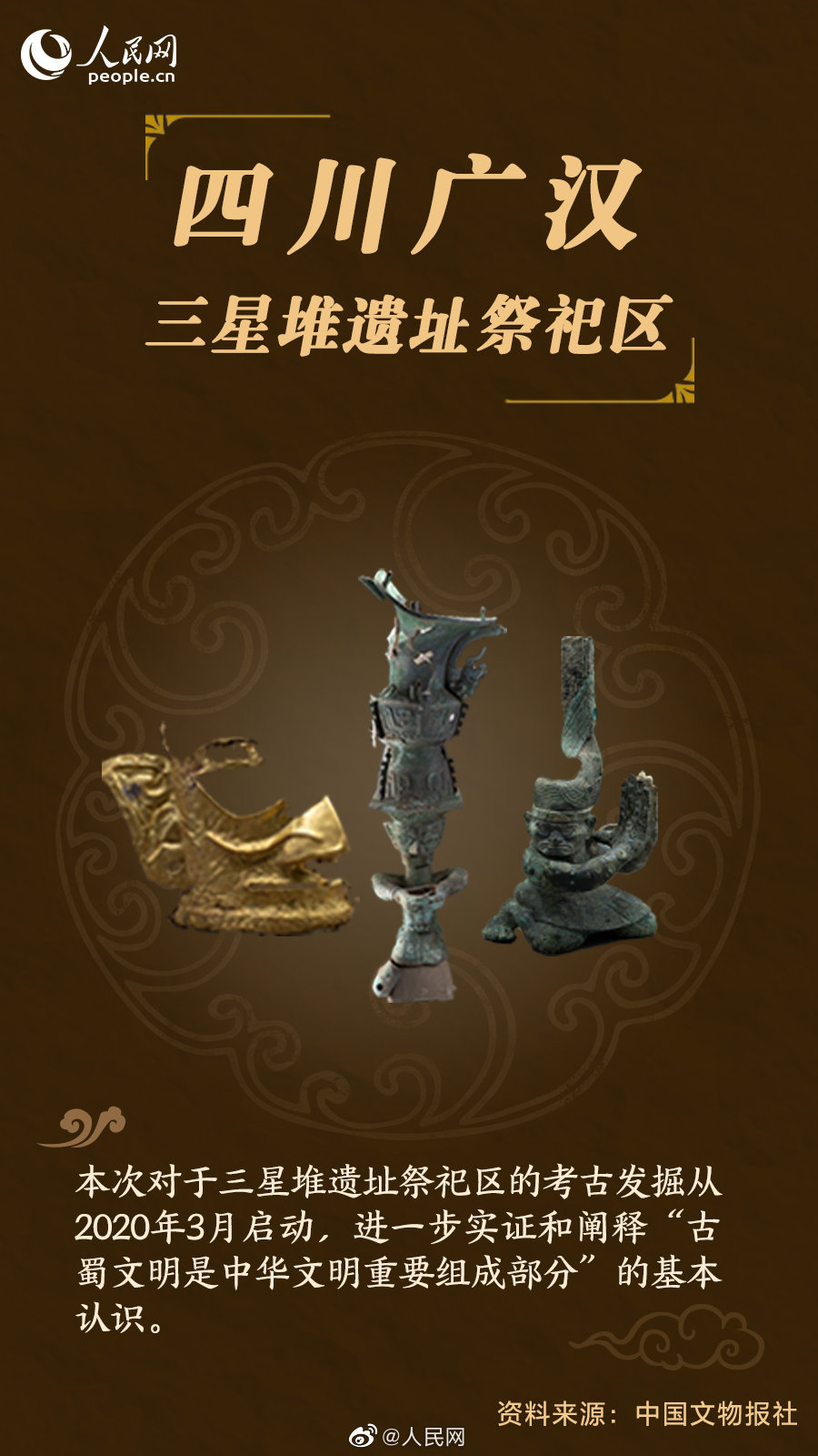 ①四川稻城皮洛遗址;②河南南阳黄山遗址;③湖南澧县鸡叫城遗址;④山东滕州岗上遗址;⑤四川广汉#三星堆遗址祭祀区入选全国十大考古新发现#;⑥湖北云梦郑家湖墓地;⑦陕西西安江村大墓;⑧甘肃武威唐代吐谷浑王族墓葬群;⑨新疆尉犁克亚克库都克烽燧遗址;⑩安徽凤阳明中都遗址。(人民网 刘微)