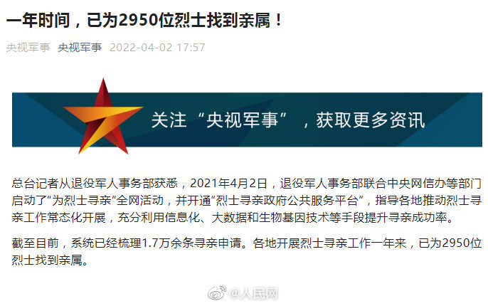 2021年4月2日,退役军人事务部联合中央网信办等部门启动了“为烈士寻亲”全网活动,并开通“烈士寻亲政府公共服务平台”,指导各地推动烈士寻亲工作常态化开展,充分利用信息化、大数据和生物基因技术等手段提升寻亲成功率。截至目前,系统已经梳理1.7万余条寻亲申请。各地开展烈士寻亲工作一年来,已为2950位烈士找到亲属。@央视军事