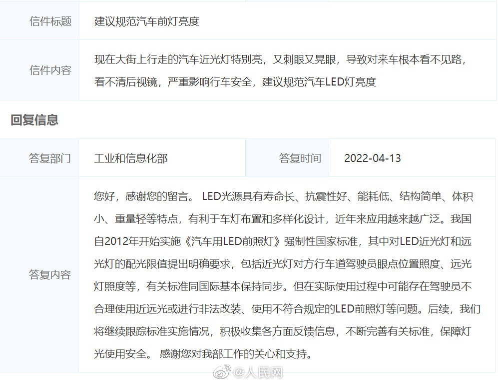 工信部回复规范汽车近光灯亮度:将不断完善有关标准